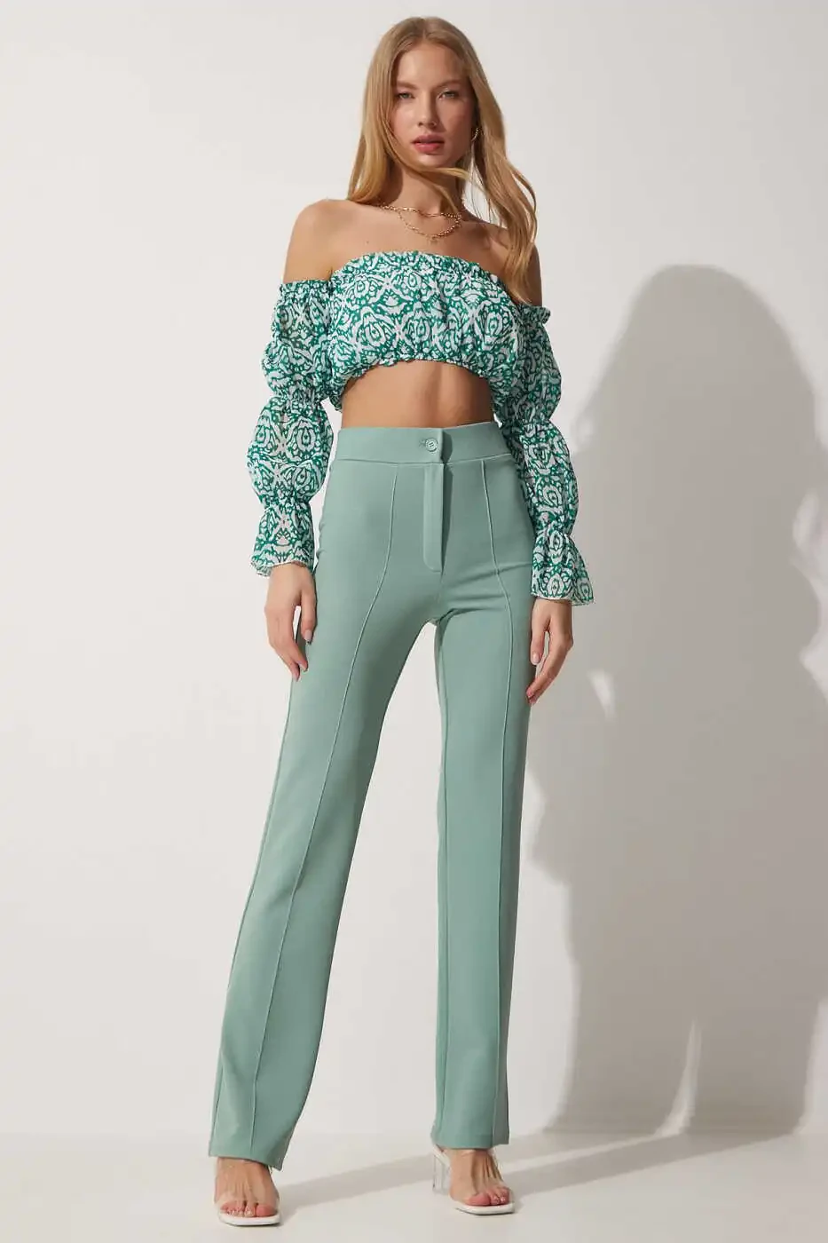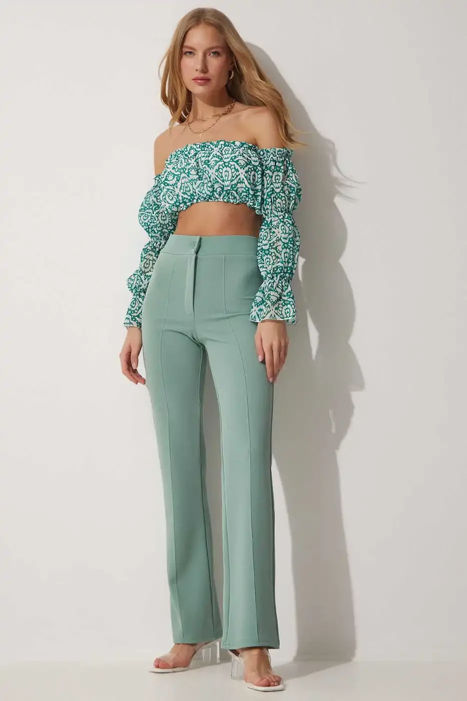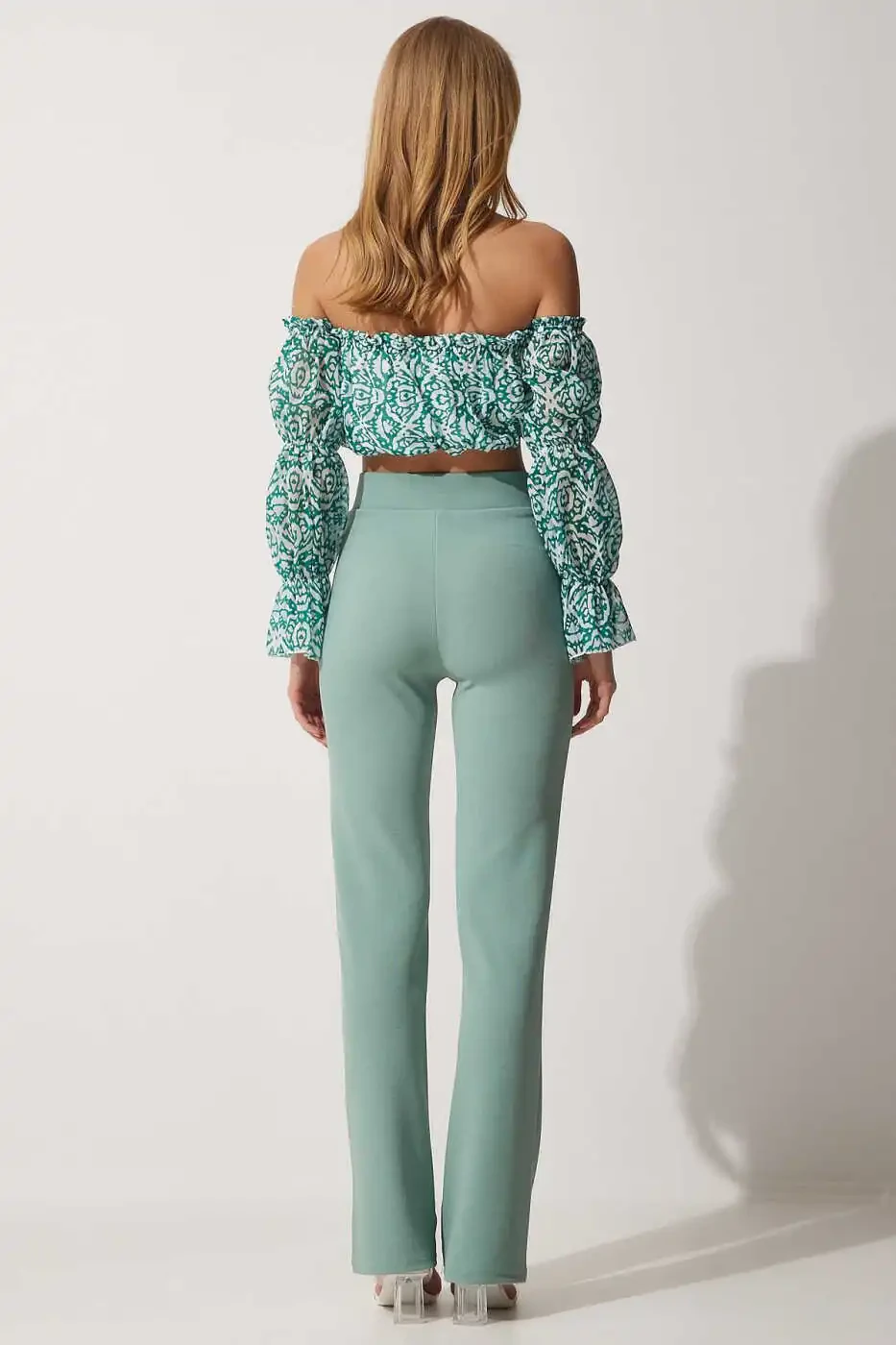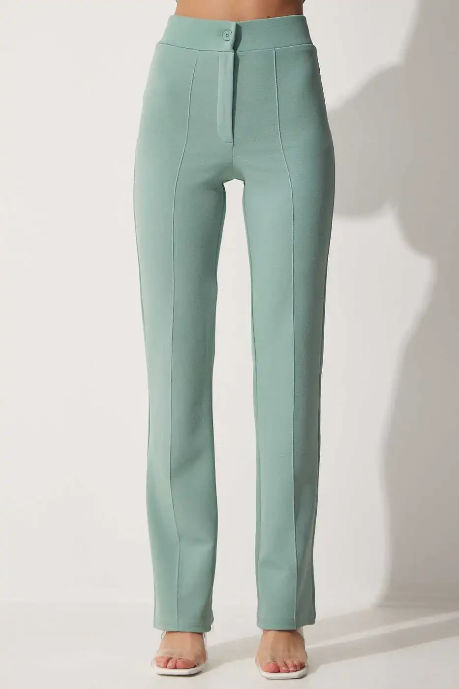 Женские брюки цвета морской волны с высокой посадкой, эластичные, удобные из трикотажной ткани, высокая посадка, эластичные, удобная трикотажная ткань.