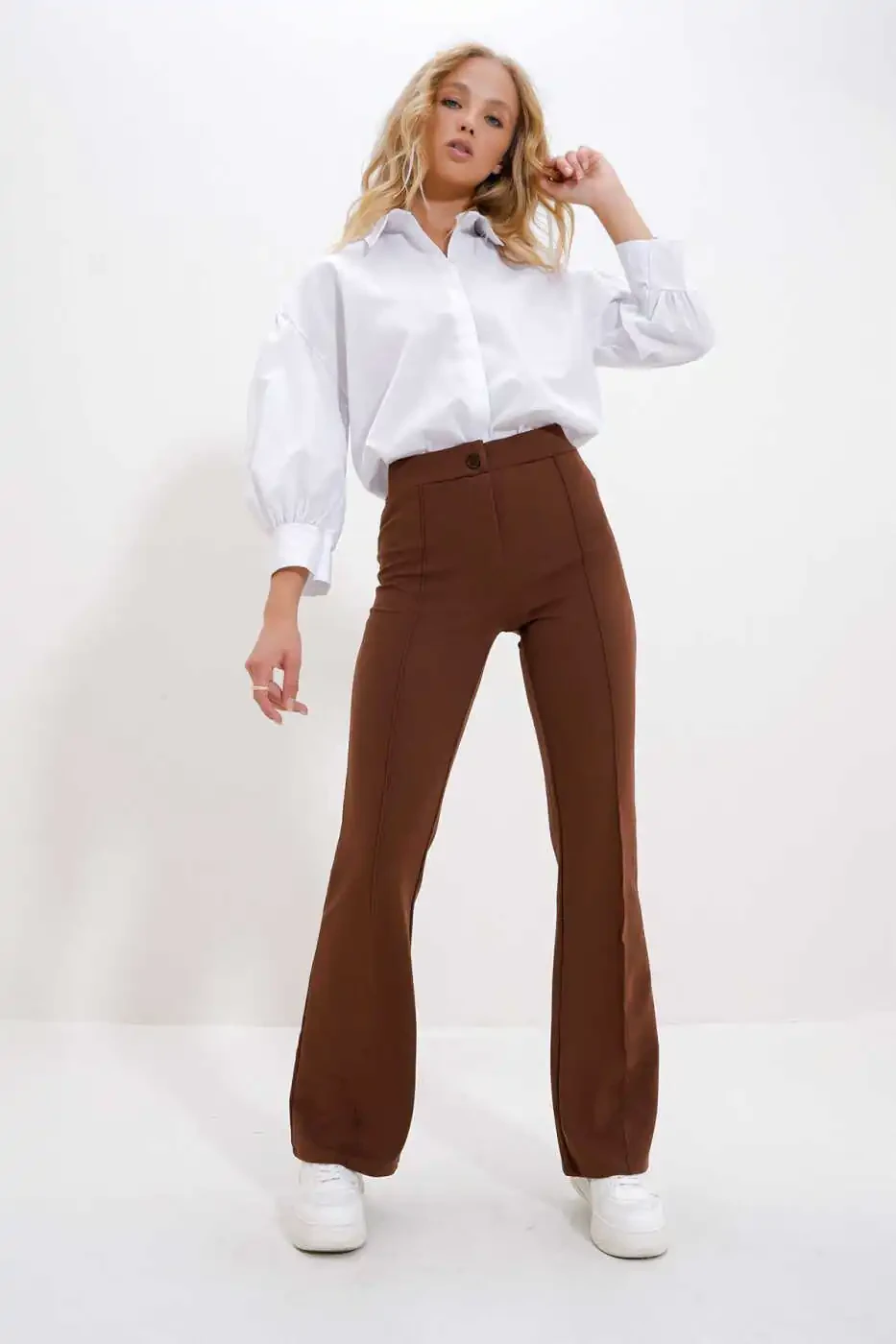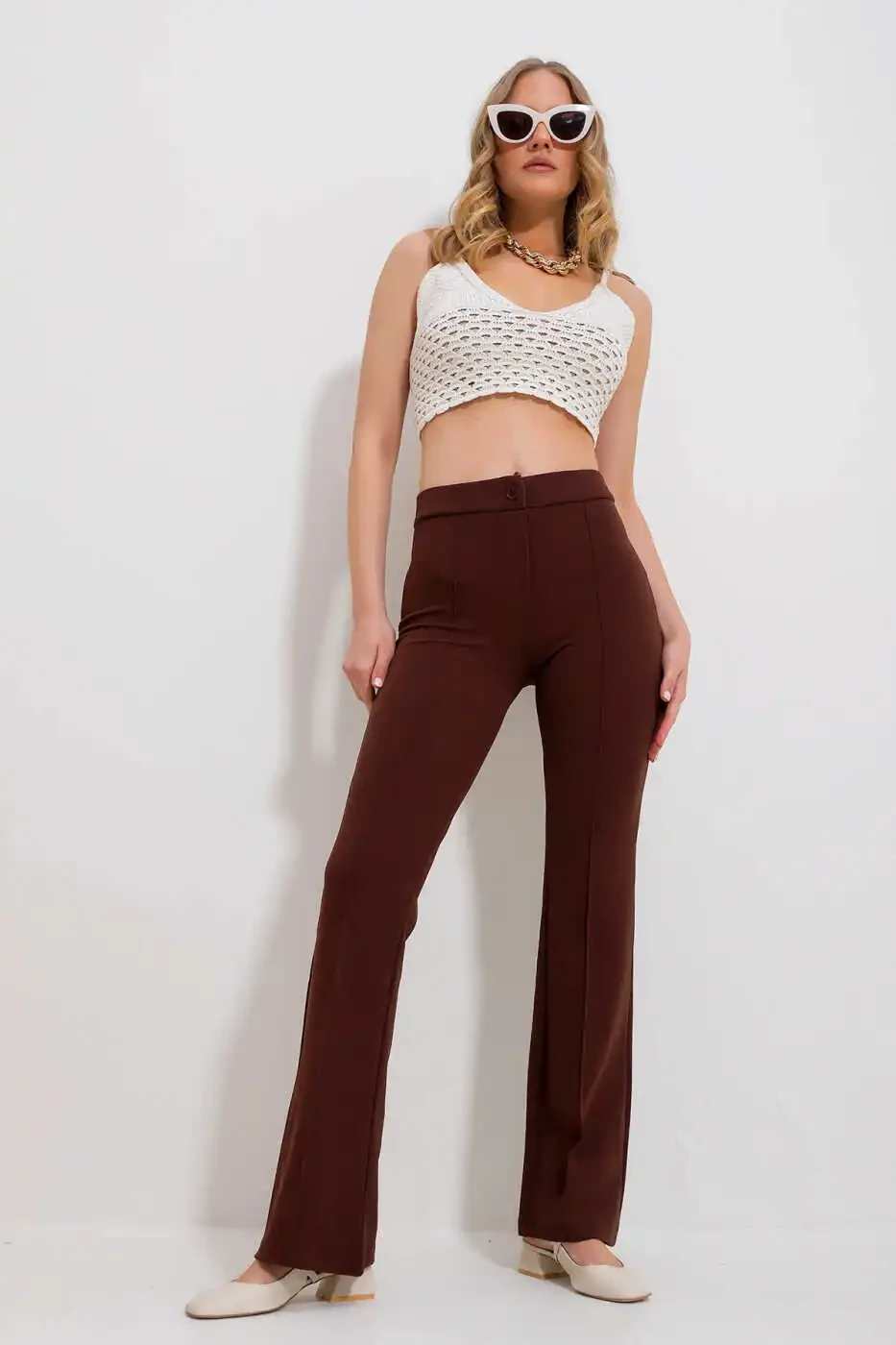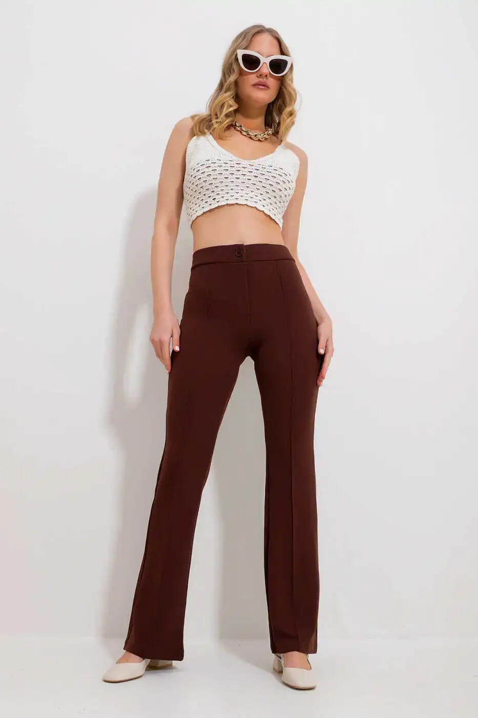 Сочетающие в себе стиль и комфорт, Женские Кофейные Брюки с Высокой Посадкой и Разрезом Спереди Широкие Брюки из Ликры ALC-X9979 станут незаменимой частью вашего гардероба. Брюки, подчеркивающие ваш силуэт благодаря высокой посадке, добавляют стильный акцент за счет разрезов спереди. Обеспечивая свободу движений благодаря широким штанинам, брюки обеспечивают комфортное использование в течение всего дня благодаря ликряной ткани.