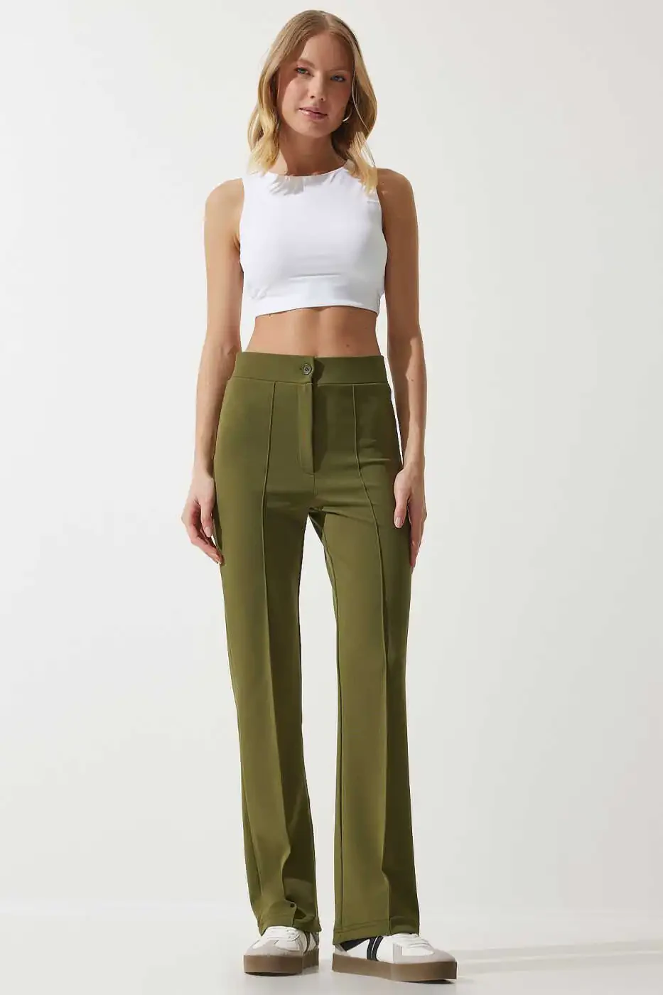 Комфортные трикотажные брюки RV00090 цвета хаки с высокой талией и из эластичного материала позволят вам сочетать стиль и комфорт! Эти брюки, созданные по уникальному дизайну, изготовлены из высококачественной ткани, состоящей из 60% полиэстера, 20% хлопка и 20% эластана, гарантируя комфорт на весь день. Высокая талия подтягивает живот, создавая более стройный и изящный силуэт. Брюки цвета хаки с однотонным дизайном придают вам вневременную элегантность, а прямой крой нежно облегает фигуру, но при этом не сковывает движения. Удлиненный крой визуально удлиняет и стройнит ноги, а зауженные штанины добавляют современный и стильный образ. Благодаря прочной ткани из переплетения нитей, эти брюки будут радовать вас долгие годы и идеально сочетаются с любой верхней одеждой. Эти комфортные трикотажные брюки, входящие в нашу базовую коллекцию, станут идеальным вариантом для повседневной жизни, работы или особых случаев. В межсезонье ткань средней толщины обеспечивает оптимальный комфорт, а детали с пуговицами подчеркивают функциональность. Не упустите возможность приобрести этот товар с гарантией Trendyol!