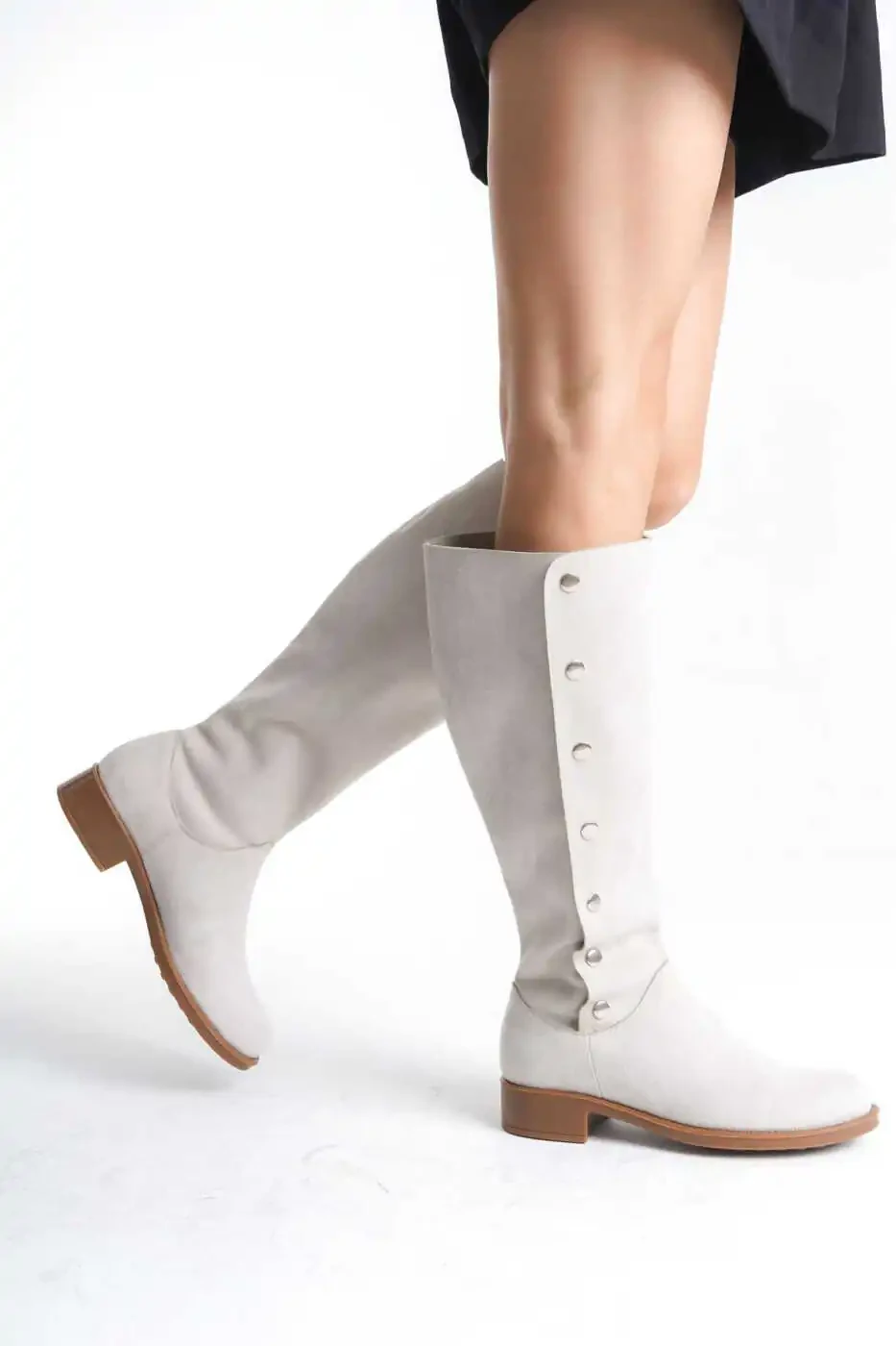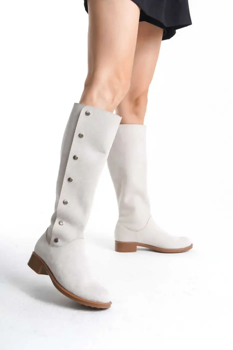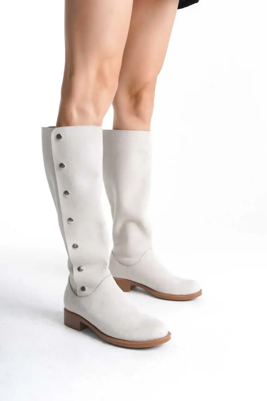 Эти сапоги, предлагающие удобный и стильный дизайн, подходящий для повседневного использования, обязательно должны быть в гардеробе каждой женщины. Элегантные детали с пуговицами добавят вашему стилю дополнительную изюминку. Мягкая замшевая поверхность позволяет вашим ногам дышать, обеспечивая комфорт в течение всего дня. Это идеальный выбор для создания стильного и теплого образа, особенно в осенне-зимние месяцы.