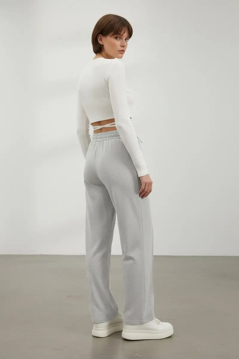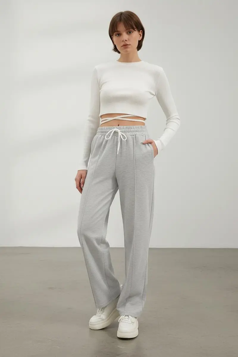 Женские серые спортивные брюки на высокой талии с кулиской и широкими штанинами, два кармана ALC-X7957, где комфорт и стиль встречаются, - это идеальный выбор для повседневной жизни и спортивных занятий. Изготовленные из мягкой и дышащей ткани, эти спортивные брюки обеспечивают комфортную носку в течение всего дня.