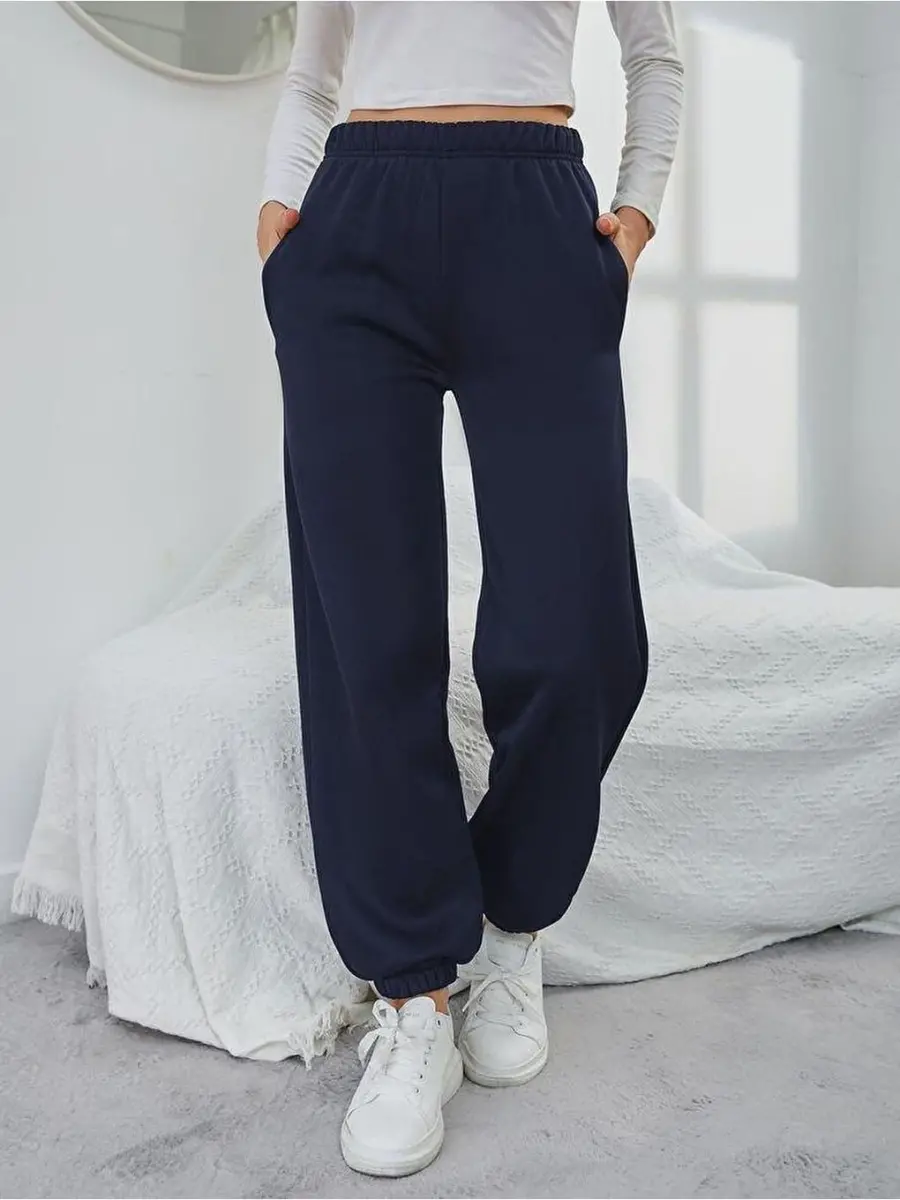 Свободные хлопковые женские спортивные брюки с высокой талией и изогнутыми штанинами.
