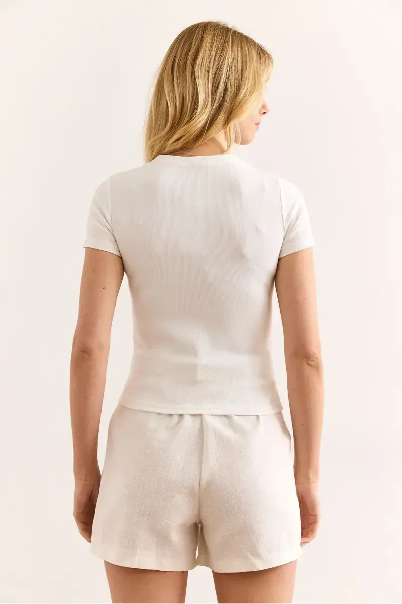 Kadın Beyaz Payet Fiyonk Detaylı İnce Fitilli Crop, şıklığı ve zarafeti bir araya getiren özel bir tasarımdır. Bu göz alıcı crop top, gardırobunuzun vazgeçilmez parçalarından biri olmaya aday. Beyazın asaleti, payetlerin ışıltısı ve fiyonk detayının romantik dokunuşu, her kombininize farklı bir hava katacak. İnce fitilli yapısı, vücut hatlarınızı zarifçe ortaya çıkarırken, konforlu kumaşı gün boyu rahatlık sunar. Özel davetlerden günlük şıklığa kadar her ortamda dikkatleri üzerinize çekmenizi sağlayacak bu crop top, modern ve trend bir görünüm elde etmek isteyen kadınlar için ideal bir seçimdir. İster yüksek bel bir etekle kombinleyerek şık bir görünüm yaratın, ister jeanlerle daha casual bir tarz yakalayın, bu crop top ile her zaman stil sahibi olacaksınız. OLA LOOK OFFICIAL kalitesiyle sunulan bu ürün, dayanıklı materyalleri ve özenli işçiliği ile uzun ömürlü kullanım imkanı sunar. Gardırobunuzu yenilemek ve tarzınızı ön plana çıkarmak için bu benzersiz parçayı kaçırmayın. Payetlerin ışıltısı ve fiyonk detayının cazibesiyle, her anınızda kendinizi özel hissedeceksiniz. Bu crop top, sadece bir giysi değil, aynı zamanda bir stil ifadesidir. Her kadının sahip olmak isteyeceği, zamansız bir şıklık sunan bu parça ile fark yaratın.