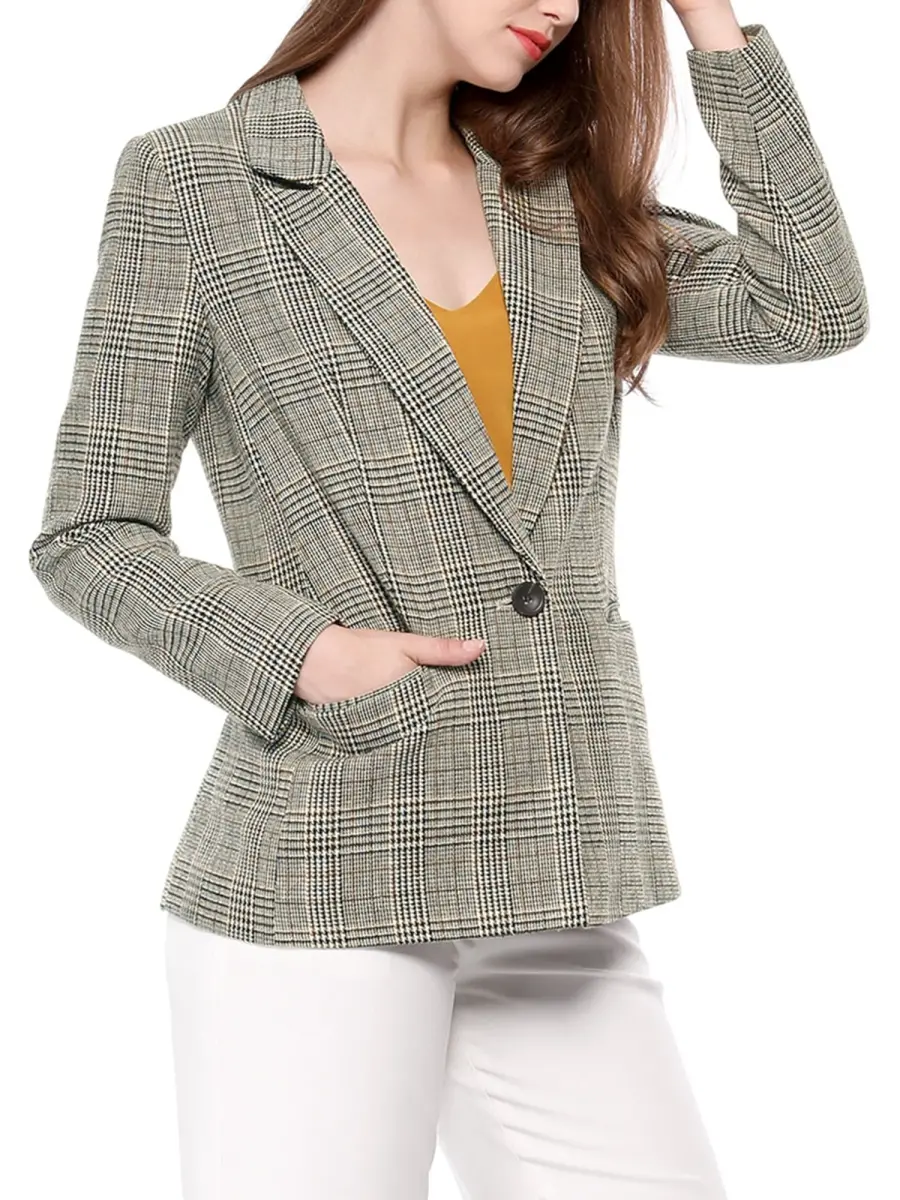 Сочетая стиль и элегантность, блейзер Allegra K для женщин с отложным воротником на одной пуговице, до бедер, станет незаменимой частью вашего гардероба. С элегантным отложным воротником, застежкой на одну пуговицу и кроем до бедер блейзер предлагает современный вид с классическим узором «гусиная лапка». Изготовленный из мягкой и высококачественной ткани, блейзер универсален и удобен в носке с любым нарядом. Будь то деловые встречи, повседневная жизнь или специальные мероприятия, этот стильный блейзер всегда будет дополнять ваш стиль.