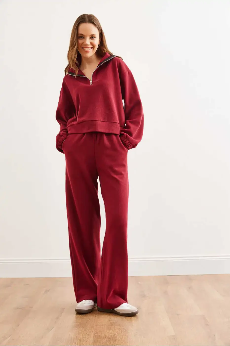 Женский бордовый костюм, костюм с воротником-поло, турецкий костюм, комплект из топа и низа, женская одежда на Trendyol