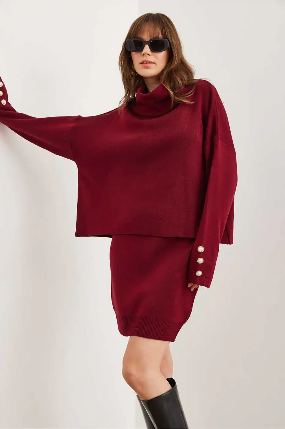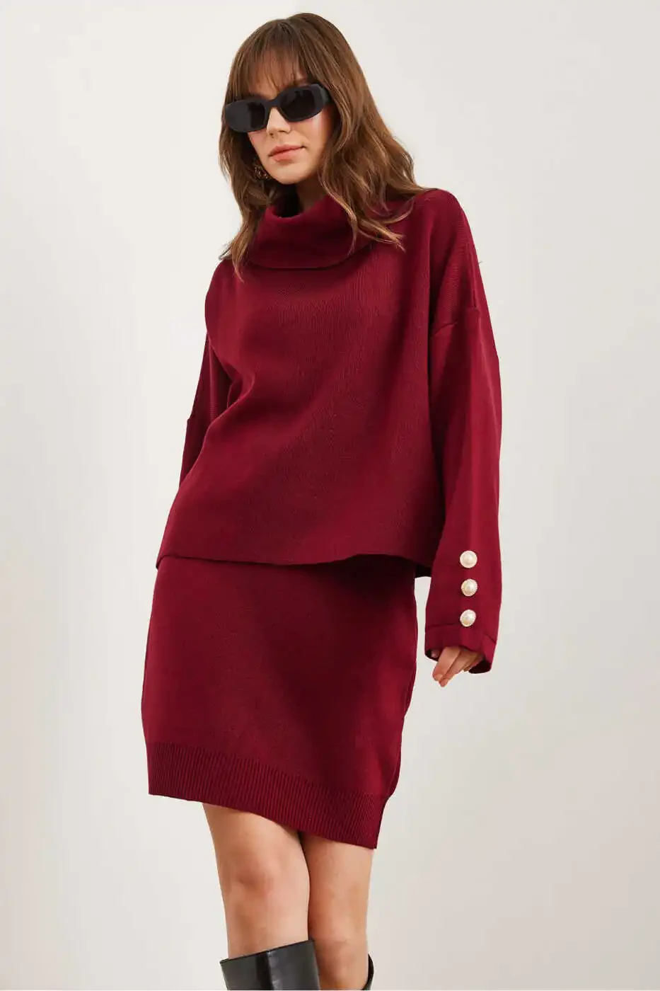 Трикотажный комплект, Бордовый свитер, Плиссированная юбка, Детали с верхними пуговицами, 100% акрил, Эксклюзив Trendyol, Женская одежда