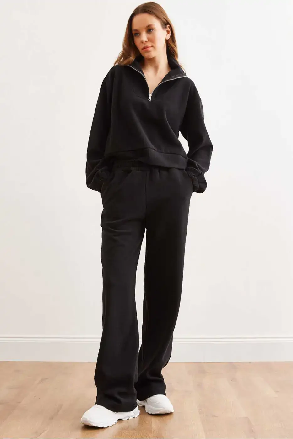 **Женский черный комплект с поло и резинкой TKM-19000324**Отправлено Trendyol - Olalook, этот шикарный комплект добавит изысканности в ваш гардероб.**Особенности:*** Мягкая и приятная на ощупь ткань из 70% хлопка и 30% полиэстера* Топ с воротником-поло и длинными рукавами* Брюки с эластичным поясом и широкими штанинами* Современный и вневременной дизайн**Размеры:*** Топ: длина/обхват груди: 50/48 см* Низ: длина/обхват талии: 108/35 см**Параметры модели:*** Рост: 1,74 м* Обхват груди: 80 см* Обхват талии: 60 см* Обхват бедер: 90 см**Детали товара:*** На модели надет размер S/36/1* Цвета могут отличаться на студийных фотографиях из-за различий в освещении**Ограничения при покупке:*** Можно заказать не более 10 штук* Заказы, превышающие 10 штук, могут быть отменены Trendyol* Для корпоративных заказов могут применяться другие ограничения**Условия возврата:*** Бесплатный возврат в течение 15 дней* Для получения дополнительной информации [page="return_conditions"]нажмите здесь[/page]