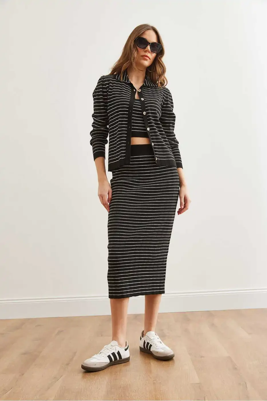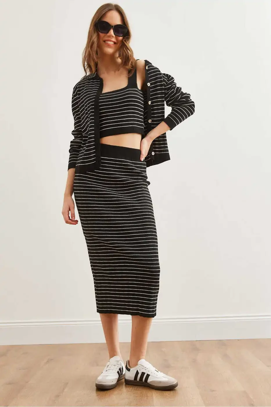 ## Женский черный 3-х частный трикотажный комплект в полоску