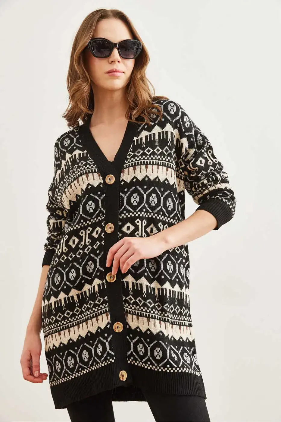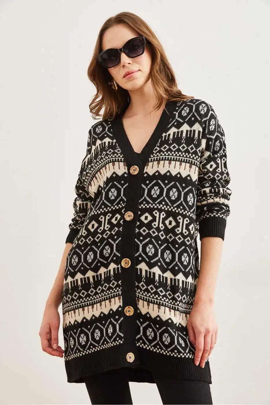 Приветствуем всех любителей моды! Приготовьтесь добавить изюминку в свой гардероб с нашим новым женским черным кардиганом большого размера с этническим рисунком.Этот эффектный кардиган не только удобный и стильный, но и универсальный. Он изготовлен из мягкой и удобной 100% акриловой ткани, которая согреет вас в холодную погоду. Текстурированный узор в этническом стиле придает уникальный штрих любому наряду, а свободный крой обеспечивает расслабленную и непринужденную посадку.Универсальный черный цвет позволяет создавать бесконечное множество образов. Сочетайте его с джинсами, платьями или леггинсами для создания повседневного образа или дополняйте более формальными элементами для особых случаев.Всего 10 изделий доступны по этой специальной цене, поэтому не упустите возможность обновить свой гардероб! Закажите сегодня на Trendyol и воспользуйтесь уверенностью нашей 15-дневной политики бесплатного возврата.Мы предлагаем быструю доставку и бесплатную доставку, чтобы обеспечить вам наилучший опыт покупок. Для получения подробной информации о наличии и категориях продуктов посетите нашу страницу.