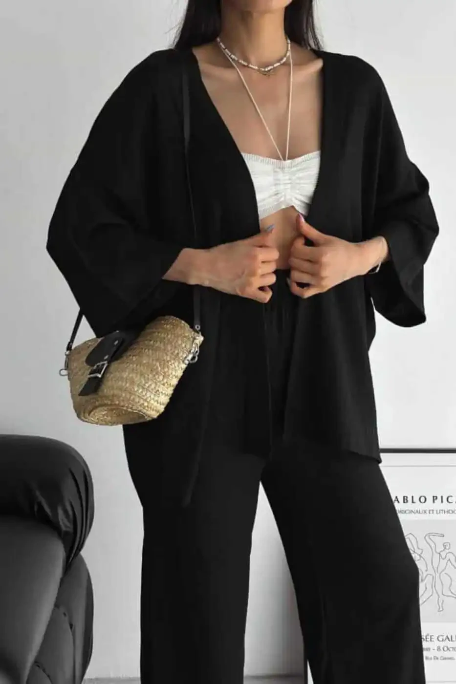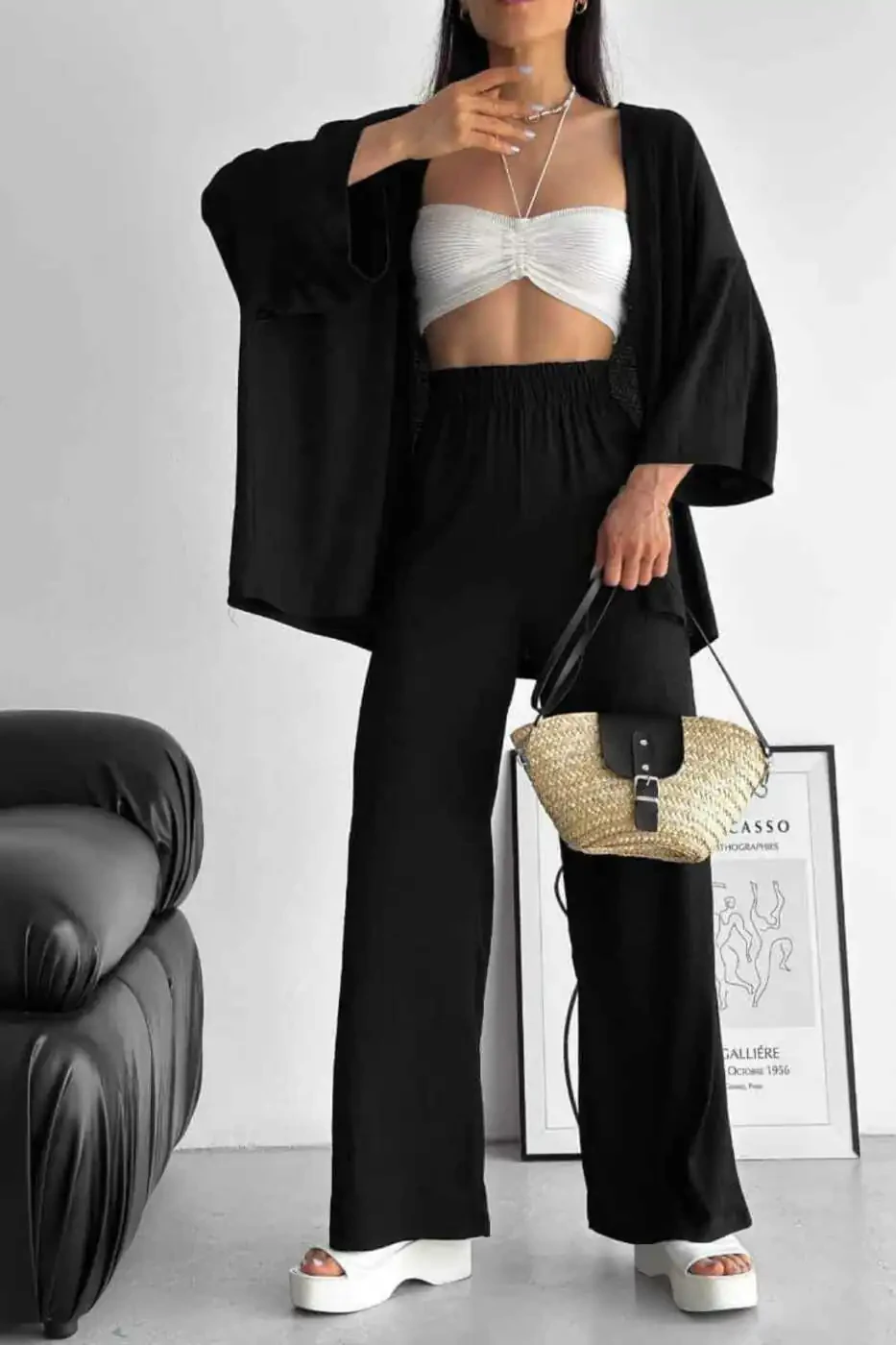 Этот женский черный костюм с широкими штанами-палаццо и кимоно, сочетающий в себе стиль и комфорт, станет вашим новым любимцем в гардеробе. Изготовленный из мягкой и дышащей ткани, костюм обеспечивает комфортную носку в течение всего дня. Штаны-палаццо с широкими штанинами придают стильный и современный вид, подходящий для любого случая. Кимоно, с его изящным и удобным кроем, делает вас красивой везде. Вы можете выбрать тонкий пояс или стильное ожерелье, чтобы дополнить свой образ. Этот костюм можно комфортно носить как в повседневной жизни, так и на особых мероприятиях.