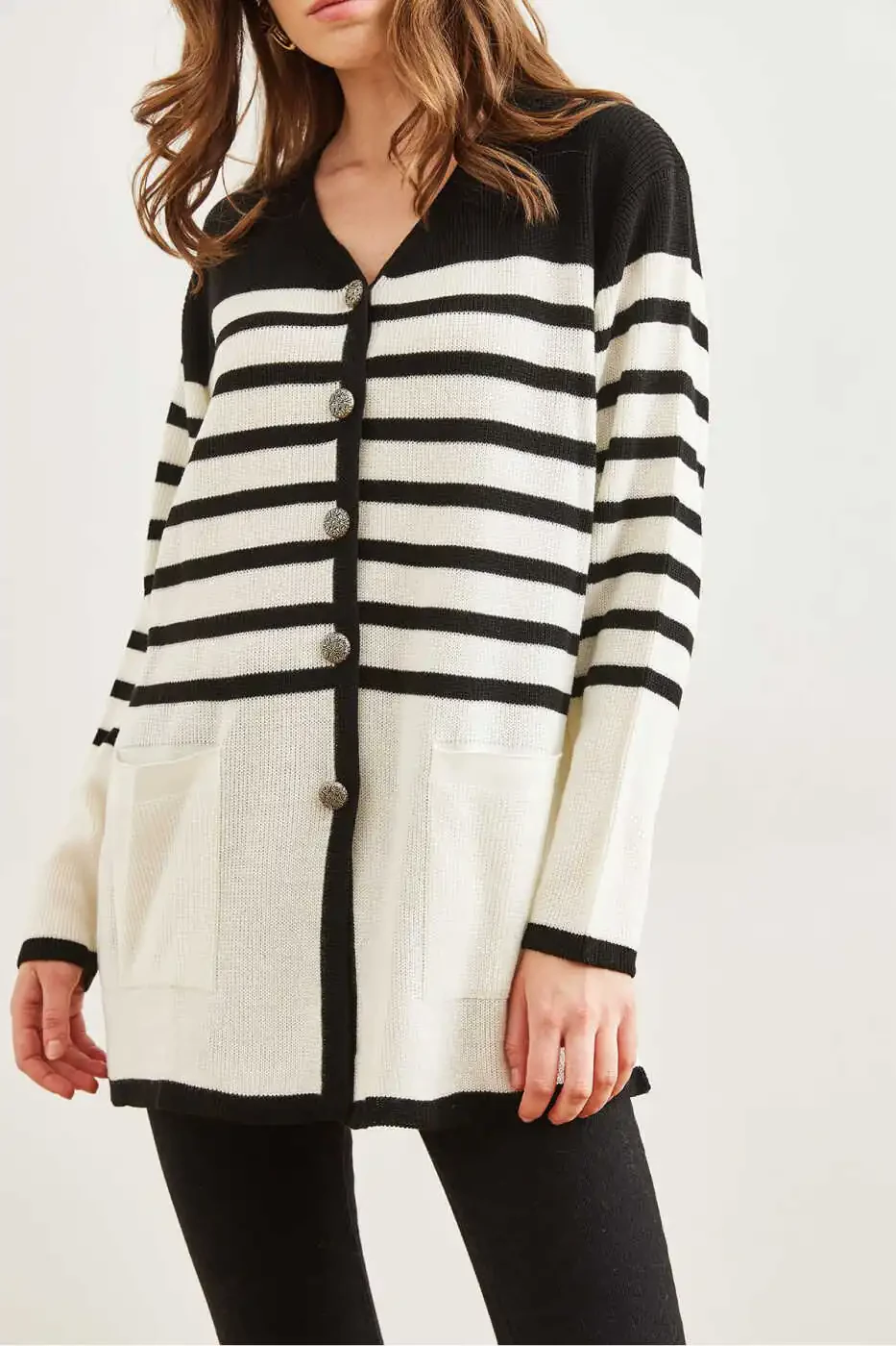 Женский черный трикотажный кардиган с металлическими пуговицами в полоску | Olalook