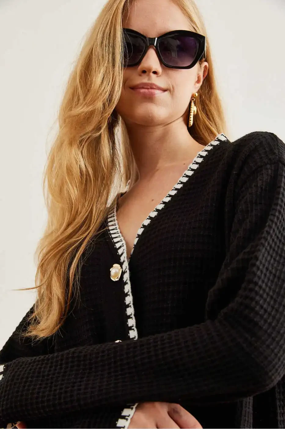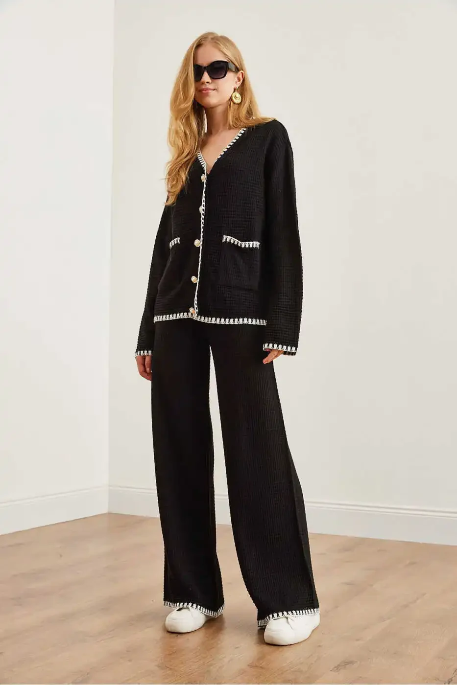 **Женский черный трикотажный комплект с топом-кардиганом и брюками с отделкой кантом**