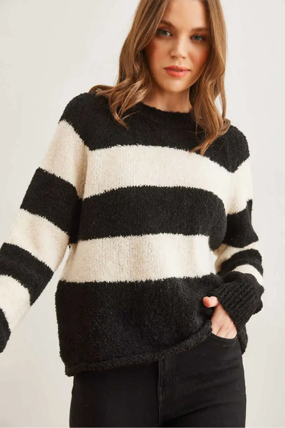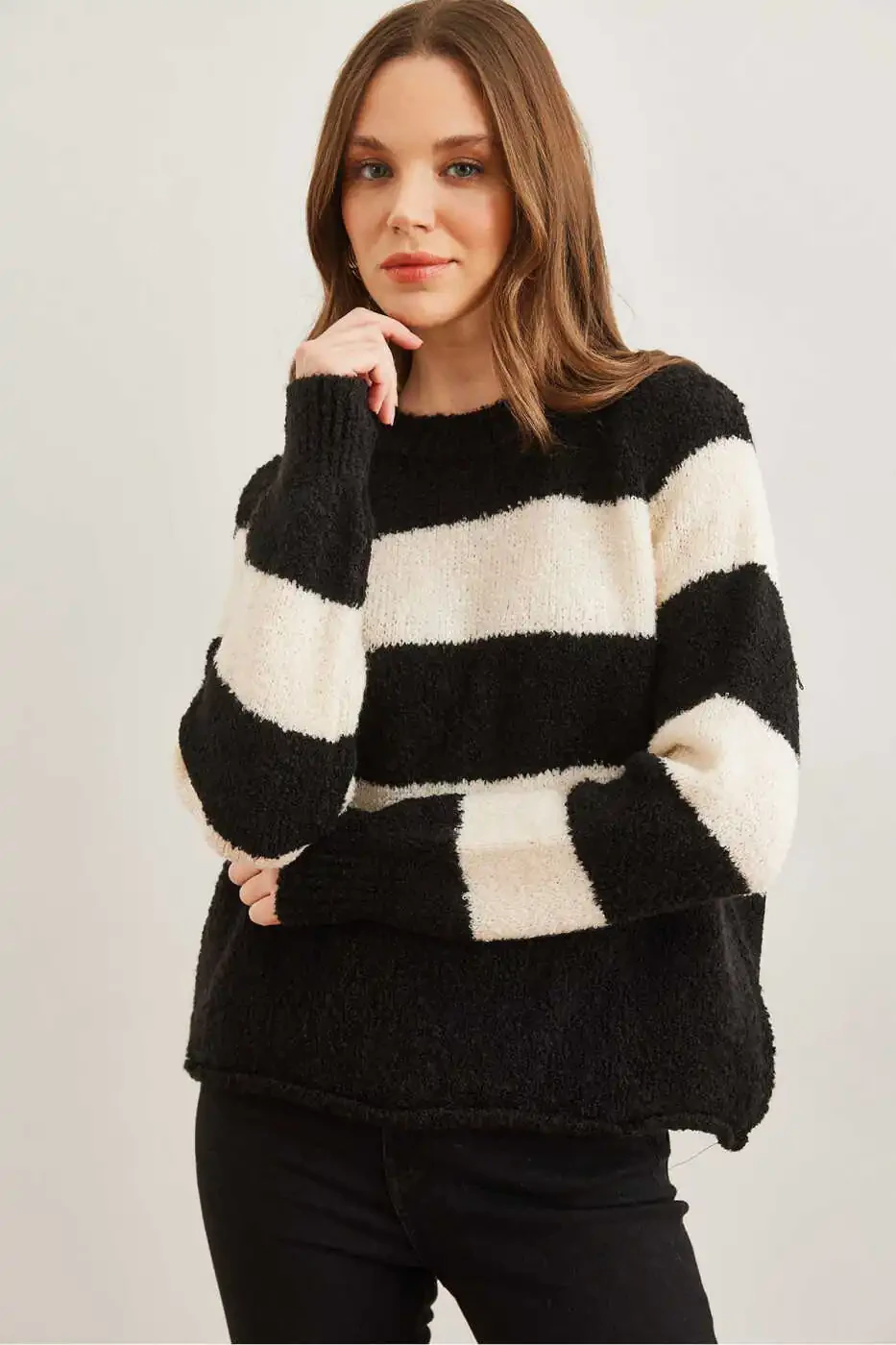 Встречайте зиму с шиком и комфортом в нашем **Женском черном свитере крупной вязки с круглым вырезом**. Изготовленный из смесового материала 80% акрила и 20% лайкры, этот трикотажный свитер отличается мягкостью и эластичностью, обеспечивая идеальную посадку. Дизайн с круглым вырезом обеспечивает как комфорт, так и стиль, в то время как узор из толстых полос добавляет вневременной привлекательности и придает изысканность любому наряду. Длина свитера 55 см, обхват груди 50 см, он представлен в стандартном размере. Параметры модели: рост 1,73 см, обхват груди 85 см, обхват талии 63 см, обхват бедер 90 см. Пожалуйста, обратите внимание, что цвета могут незначительно отличаться при разном освещении. Закажите свой свитер прямо сейчас на **Trendyol - Olalook**. Не упустите наши выгодные цены и приобретайте более 5 единиц этого незаменимого предмета гардероба. Воспользуйтесь бесплатным возвратом в течение 15 дней.