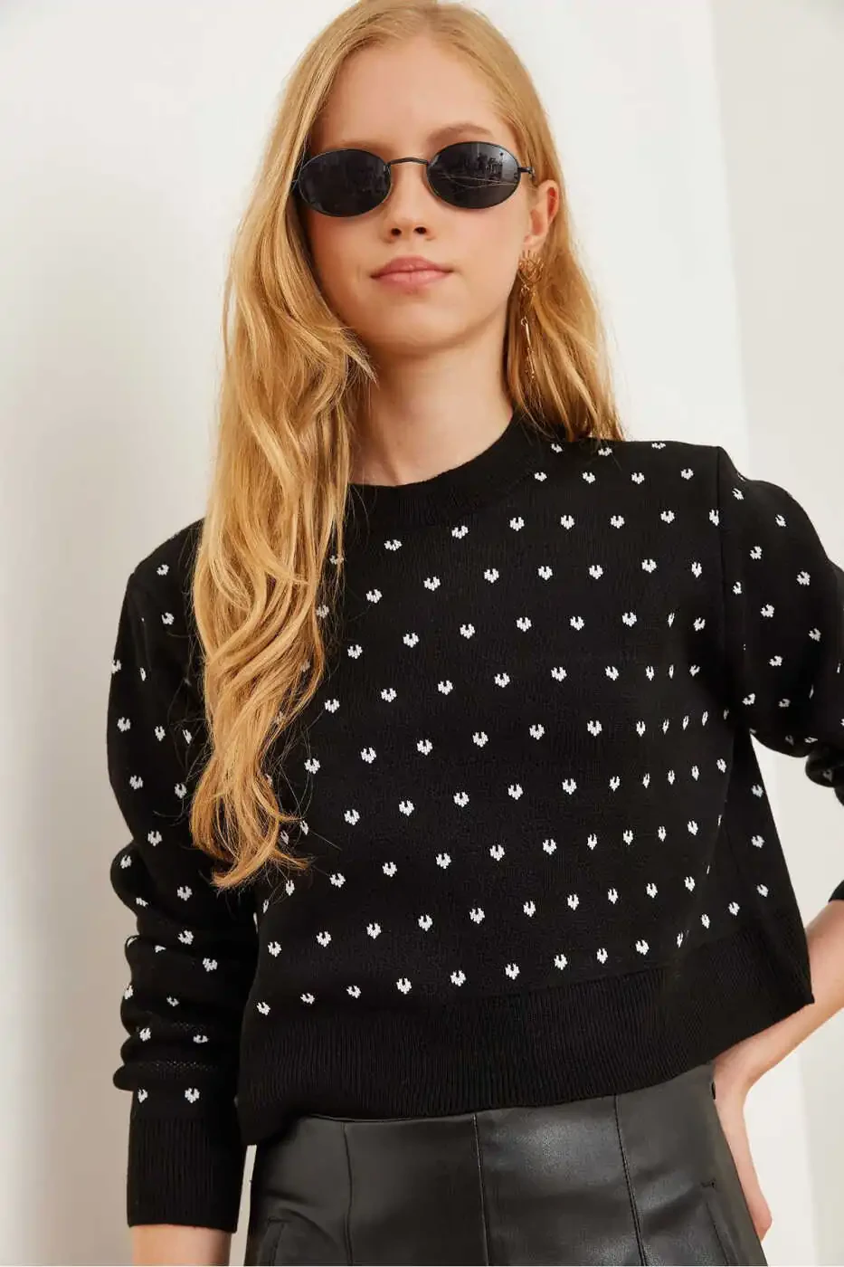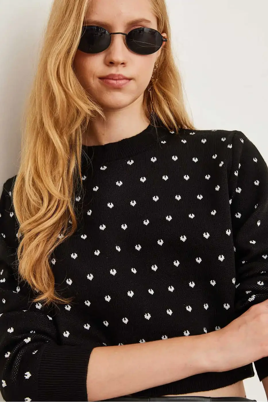 Женский трикотажный свитер, Черный трикотажный свитер, Укороченный трикотажный свитер, Трикотажный свитер с деталью в виде сердца, Olalook