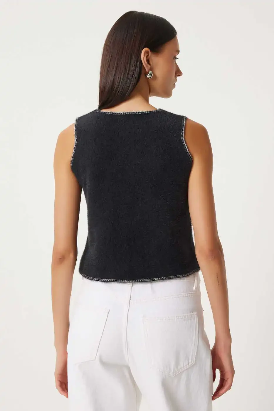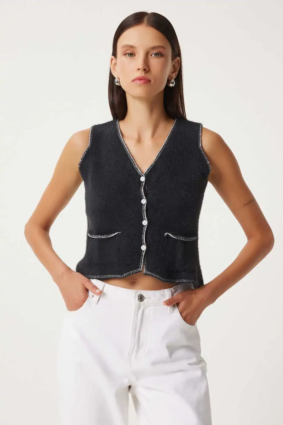Женский черный трикотажный жилет с V-образным вырезом YY00219 легко сочетается с другими вещами в вашем гардеробе. Он отлично смотрится с джинсами, юбками или платьями. Он обеспечит стильный и комфортный образ как в повседневной жизни, так и в особых случаях. Этот жилет, изготовленный из высококачественных материалов, отличается прочностью и будет служить вам долгие годы. Черный цвет — очень практичный выбор, так как он подходит к любой одежде. Вы можете дополнить свой стиль различными цветовыми вариантами и комбинациями, создав свой собственный уникальный образ. Если у вас есть какие-либо вопросы или запросы по поводу товара, пожалуйста, не стесняйтесь обращаться в нашу службу поддержки.