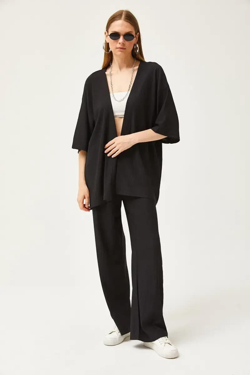 Женский черный комплект: кимоно-топ и брюки TKM-1900 - это особая комбинация, сочетающая в себе элегантность и комфорт, с современным и элегантным дизайном. Этот комплект - универсальный вариант, который должен быть в гардеробе каждой женщины. Этот комплект, который можно носить как в повседневной жизни, так и на особые мероприятия, поможет вам наилучшим образом отразить свой стиль.Кимоно-топ обеспечивает свободу движений благодаря своему удобному и широкому крою, а также придает элегантный и изящный вид. Дизайн кимоно, сочетающийся с благородством черного цвета, предлагает классическую элегантность, которая может адаптироваться к любой обстановке. Высококачественная ткань обеспечивает комфорт в течение всего дня.Брюки привлекают внимание своим современным кроем и облегающим фасоном. Классический и неподвластный времени вид черного цвета придает брюкам изысканный вид. Эти брюки, одновременно стильные и удобные, позволяют вам комфортно двигаться в течение всего дня.Этот комплект не только стильный, но и практичный. Его легко комбинировать и дополнять различными аксессуарами. Независимо от того, собираетесь ли вы на элегантное мероприятие на каблуках или создаете повседневный образ с кроссовками, этот комплект всегда будет сопровождать вас.Женский черный комплект: кимоно-топ и брюки TKM-1900 предлагает длительное использование благодаря высококачественной ткани, тщательному исполнению и стильному дизайну. Этот комплект, который станет незаменимой частью вашего гардероба, всегда позволит вам чувствовать себя стильно и уверенно. Выберите этот комплект, чтобы отразить свой стиль и привлечь внимание, и вы выделитесь. Дайте элегантности заговорить с помощью магии черного. Этот комплект - не просто одежда, это еще и выражение стиля. Обязательно попробуйте женский черный комплект: кимоно-топ и брюки TKM-1900, чтобы почувствовать себя особенной и наилучшим образом отразить свой стиль. Откройте для себя идеальное сочетание элегантности и комфорта.