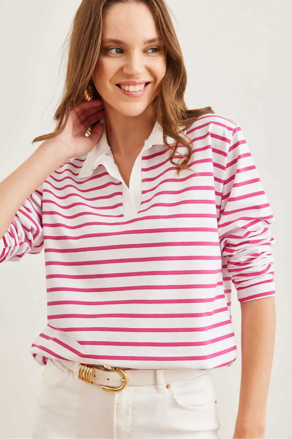 Женский полосатый свитшот с воротником-поло цвета фуксии: где встречаются стиль и комфорт