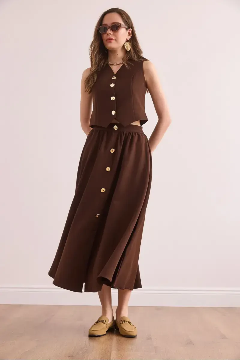 Женский жилет цвета горького кофе с подкладкой сверху, расклешенный с пуговицами снизу — это современный и элегантный дизайн, который обязательно станет одной из ваших любимых вещей в гардеробе. Теплота цвета горького кофе, женственный крой клеш и элегантность пуговиц создают неповторимый стиль. Подкладка в верхней части жилета обогащает его внешний вид и обеспечивает комфорт в течение всего дня. Он согреет вас в холодную погоду и подарит легкость и комфорт в теплую погоду. Пуговицы в нижней части придают жилету уникальный вид и облегчают надевание и снятие. Этот жилет, позволяющий создавать различные комбинации, можно с легкостью использовать как в повседневной жизни, так и на особых мероприятиях. Вы можете создать спортивный образ с джинсами или более шикарный образ, сочетая его с юбкой или платьем. Этот жилет, изготовленный из высококачественной ткани и с тщательной отделкой, станет незаменимой вещью в вашем гардеробе, который вы сможете носить долгие годы, как в первый день. Каждый раз, когда вы захотите почувствовать себя особенной и стильной, вы сможете дополнить свой образ женским жилетом цвета горького кофе с подкладкой сверху, расклешенным с пуговицами снизу. Этот стильный и практичный жилет — особая вещь, которая должна быть в гардеробе каждой женщины. Обязательно попробуйте этот жилет, чтобы выразить свой стиль и привлечь внимание в любой обстановке. Этот жилет, который будет сопровождать вас как в повседневной жизни, так и в особые моменты, подчеркнет вашу элегантность и изящество. Подчеркните свой стиль с помощью женского жилета цвета горького кофе с подкладкой сверху, расклешенного с пуговицами снизу!