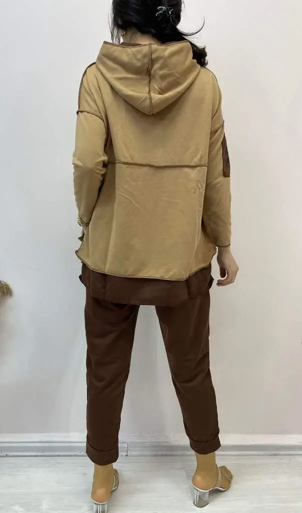 Женский кофейный костюм-двойка с капюшоном, деталями отделки по низу и нашивкой – это вариант, сочетающий в себе элегантность и комфорт и привлекающий внимание своим уникальным дизайном. Этот костюм, который будет сопровождать вас в повседневной жизни или в особые моменты, является одним из предметов, которые обязательно должны быть в гардеробе современной и стильной женщины. Размер M/38 на модели показывает, насколько хорошо пропорции и крой костюма сидят на фигуре. Это способствует общему виду костюма и комфорту того, кто его носит.Этот костюм-двойка выполнен в теплых и естественных тонах кофейного цвета, а верх с капюшоном и детали отделки по низу придают ему другую атмосферу. Дизайн с капюшоном не только придает спортивный вид, но и обеспечивает практичное использование благодаря своей способности защищать голову в прохладную погоду. Детали отделки по низу придают костюму движение и оригинальность, позволяя вам выделиться из толпы. Деталь с нашивкой придает костюму индивидуальность, помогая подчеркнуть ваш стиль.Одной из важнейших особенностей костюма является его удобство. Благодаря ткани, обеспечивающей комфорт в течение всего дня, ваша свобода движений не ограничена. Вы можете с комфортом носить этот костюм, отдыхая дома, встречаясь с друзьями или выполняя свои повседневные дела. Верх с длинными рукавами и брючный костюм делают его идеальным выбором в межсезонье и в прохладную погоду.Этот костюм, разработанный с учетом размеров модели (рост: 165, вес: 55, грудь: 90, талия: 72, бедра: 100), скроен таким образом, чтобы соответствовать различным типам фигуры. Размер M/38 обычно считается средним, и это идеальный выбор для женщин с такими параметрами. Однако, чтобы костюм сидел на вас наилучшим образом, важно выбрать правильный размер, учитывая свои собственные параметры.Женский кофейный костюм-двойка с капюшоном, деталями отделки по низу и нашивкой не только стильный и удобный, но и обеспечивает универсальное использование. Вы можете создавать разные стили, комбинируя верхнюю и нижнюю части отдельно. Например, вы можете добиться более спортивного вида, комбинируя верх с джинсами или юбкой, или создать более классический стиль, комбинируя низ со стильной блузкой или свитером. Таким образом, вы можете легко сочетать его с другими предметами в своем гардеробе и создавать различные комбинации.Этот костюм – кандидат на то, чтобы стать незаменимой частью вашего гардероба. Это вариант, который понравится каждой женщине благодаря своей элегантности, комфорту и универсальности. Вы можете выбрать женский кофейный костюм-двойку с капюшоном, деталями отделки по низу и нашивкой, чтобы чувствовать себя особенной и стильной. Помните, что правильный выбор одежды не только улучшает вашу внешность, но и повышает вашу уверенность в себе. Этот костюм заставит вас чувствовать себя хорошо во всех отношениях и поможет наилучшим образом отразить ваш стиль.