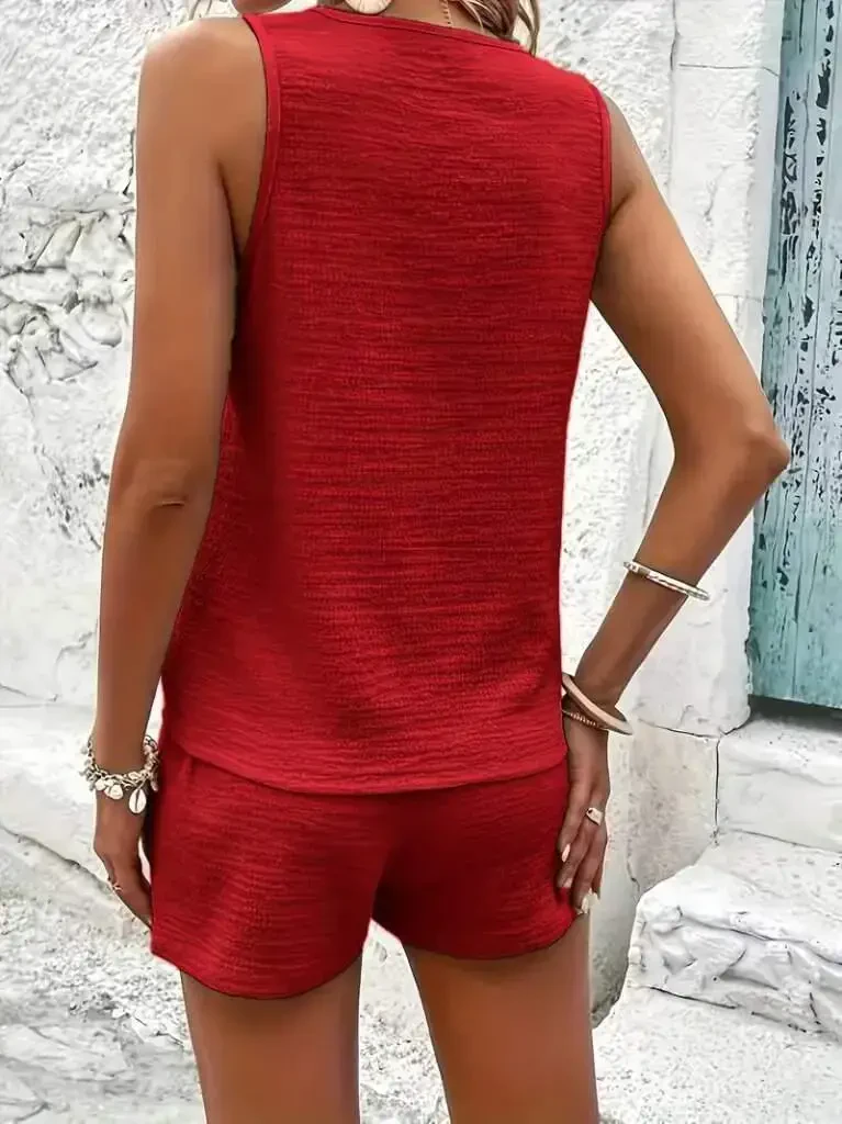 Женский комплект из блузки на бретелях без рукавов с V-образным вырезом и пуговицами спереди, а также шорт из жатой ткани станет одной из незаменимых вещей в вашем летнем гардеробе. Этот стильный и удобный комплект гарантирует, что вам будет прохладно в жаркую погоду, и при этом вы не пожертвуете своим стилем. Уникальная текстура жатой ткани придает комплекту особую атмосферу, а легкая структура обеспечивает комфорт в течение всего дня. Бретели и дизайн блузки без рукавов позволяют вашим плечам и рукам чувствовать себя свободно, а V-образный вырез подчеркивает ваш стиль. Пуговицы спереди позволяют легко надевать и снимать блузку, а также создавать разные комбинации. Вы можете добиться более расслабленного вида, оставив пуговицы расстегнутыми, или создать более стильный образ, застегнув все пуговицы. Удобный крой шорт не ограничивает вашу свободу движений и обеспечивает комфортное использование в течение всего дня. Высокая посадка делает вашу талию более стройной, а ноги – длиннее. Этот комплект из двух предметов можно легко выбрать как для повседневной носки, так и для отдыха, пляжа или бассейна. Вы можете создавать разные стили, сочетая его с сандалиями, шлепанцами или кроссовками. Вы можете дополнить свой образ шляпой, солнцезащитными очками и соломенными сумками в качестве аксессуаров, чтобы отразить энергию лета. Этот комплект, который можно использовать отдельно или в сочетании с другими предметами одежды, станет одной из самых универсальных вещей в вашем гардеробе. Естественная помятость жатой ткани значительно облегчает вам задачу, поскольку не требует глажки. Благодаря этому вы всегда будете выглядеть ухоженно и стильно. Женский комплект из блузки на бретелях без рукавов с V-образным вырезом и пуговицами спереди, а также шорт из жатой ткани станет вашим незаменимым атрибутом в летние месяцы, сочетая в себе качество, комфорт и стиль.