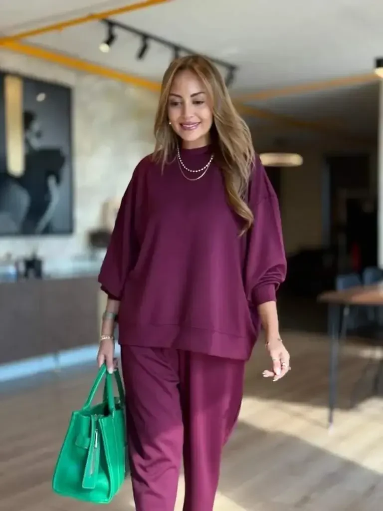 Ощутите элегантность и комфорт с женским комплектом, состоящим из фиолетовой блузки с длинными рукавами и круглым вырезом, выполненной из двухниточного вискозного трикотажа, и брюк. Этот уникальный дизайн идеально подойдет как для отдыха дома, так и для создания стильного образа на выход. Пленительный оттенок фиолетового поднимет вам настроение, а мягкая текстура вискозы обеспечит комфорт в течение всего дня. Качество двухниточной ткани гарантирует долговечность комплекта. Блузка с круглым вырезом выглядит современно и элегантно, а длинные рукава согреют вас в прохладную погоду. Удобный крой брюк не сковывает движений и обеспечивает комфорт в течение всего дня. Размер M/38 на модели разработан с учетом разных типов фигуры. Этот комплект станет незаменимой частью вашего гардероба и легко впишется в любой образ. Сочетайте его со спортивной обувью для создания повседневного образа или с туфлями на каблуке для создания элегантного образа – этот комплект всегда будет правильным выбором. Дышащая ткань предотвращает потоотделение и сохраняет ощущение свежести в течение всего дня. Этот комплект идеально подходит для женщин, которые ищут элегантность и комфорт в одном флаконе, и позволит вам привлекать внимание в любой обстановке. Натуральная текстура вискозы нежно касается кожи и сводит к минимуму риск аллергических реакций. Поэтому его могут спокойно использовать даже люди с чувствительной кожей. Прочность двухниточной ткани гарантирует, что комплект надолго останется как новый. Вы не столкнетесь с такими проблемами, как выцветание цвета или деформация. Яркость фиолетового цвета поможет вам создать энергичную и позитивную атмосферу в любое время года. Этот комплект – это не просто одежда, это образ жизни. Вы можете выбрать этот комплект каждый раз, когда захотите почувствовать себя хорошо и выглядеть стильно. Этот комплект, который станет самым любимым предметом вашего гардероба, может стать прекрасным подарком как для себя, так и для своих близких.