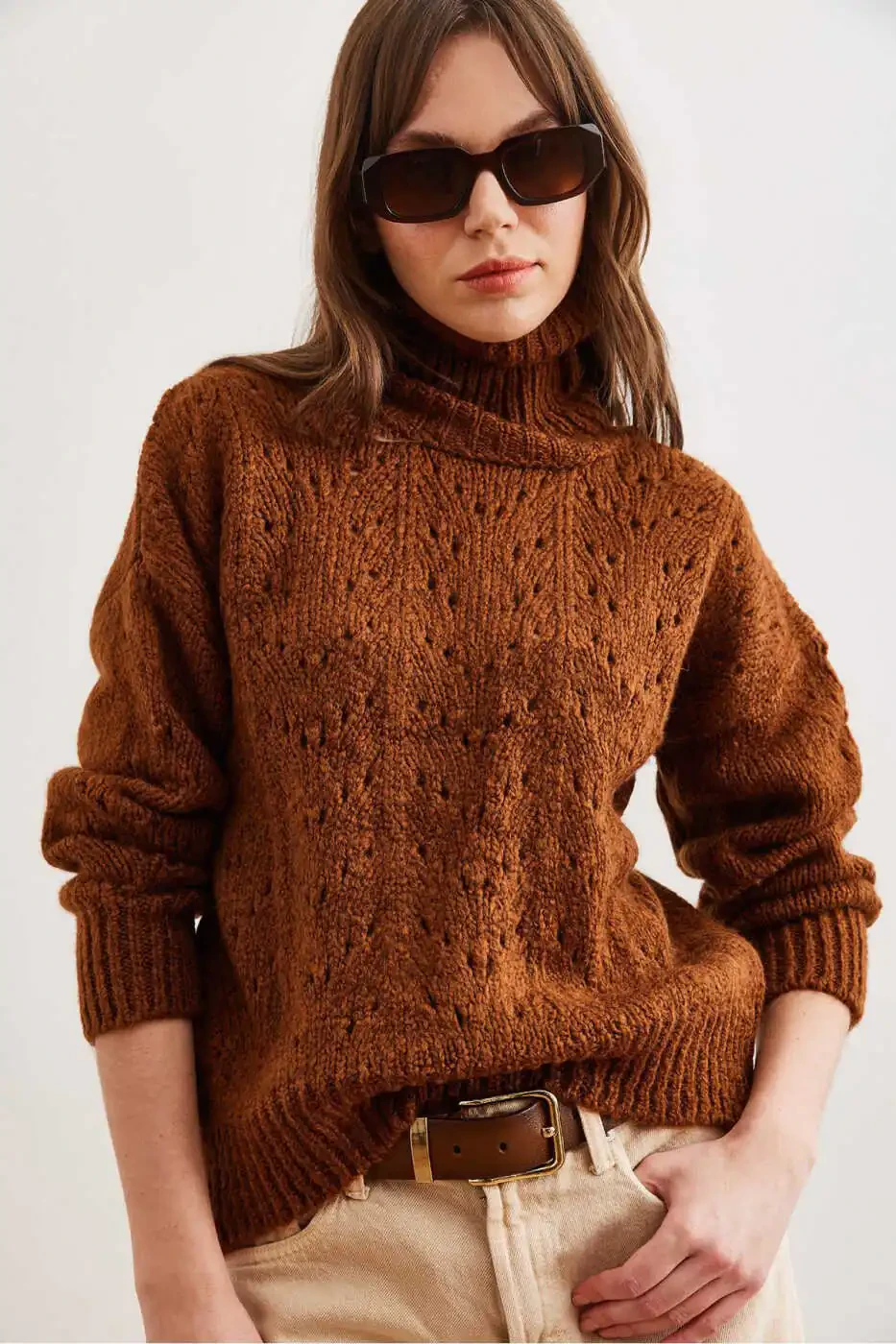 **Женский коричневый свитер с мягкой текстурой с воротом рыбака KZK-19000892**
