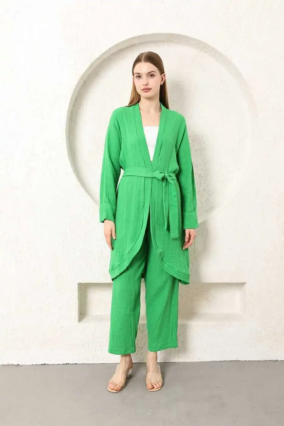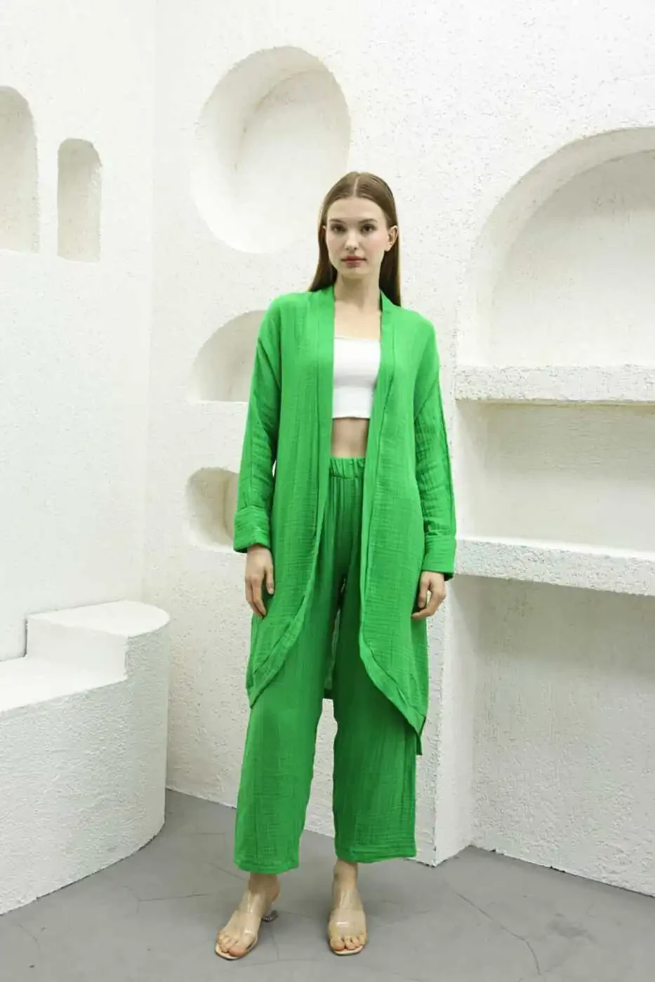 Женский комплект из брюк-кимоно и топа из муслина зеленого цвета Benetton - это выбор, который сочетает в себе стиль и комфорт. Закажите прямо сейчас и не жертвуйте своим стилем в жаркие летние дни!