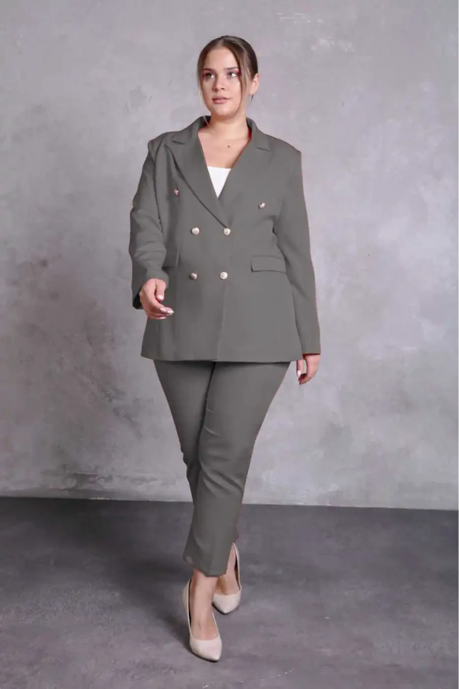 Женский Серый Блейзер с Брюками с Карманами на Поясе Плюс Размер Костюм | Стильный и Комфортный