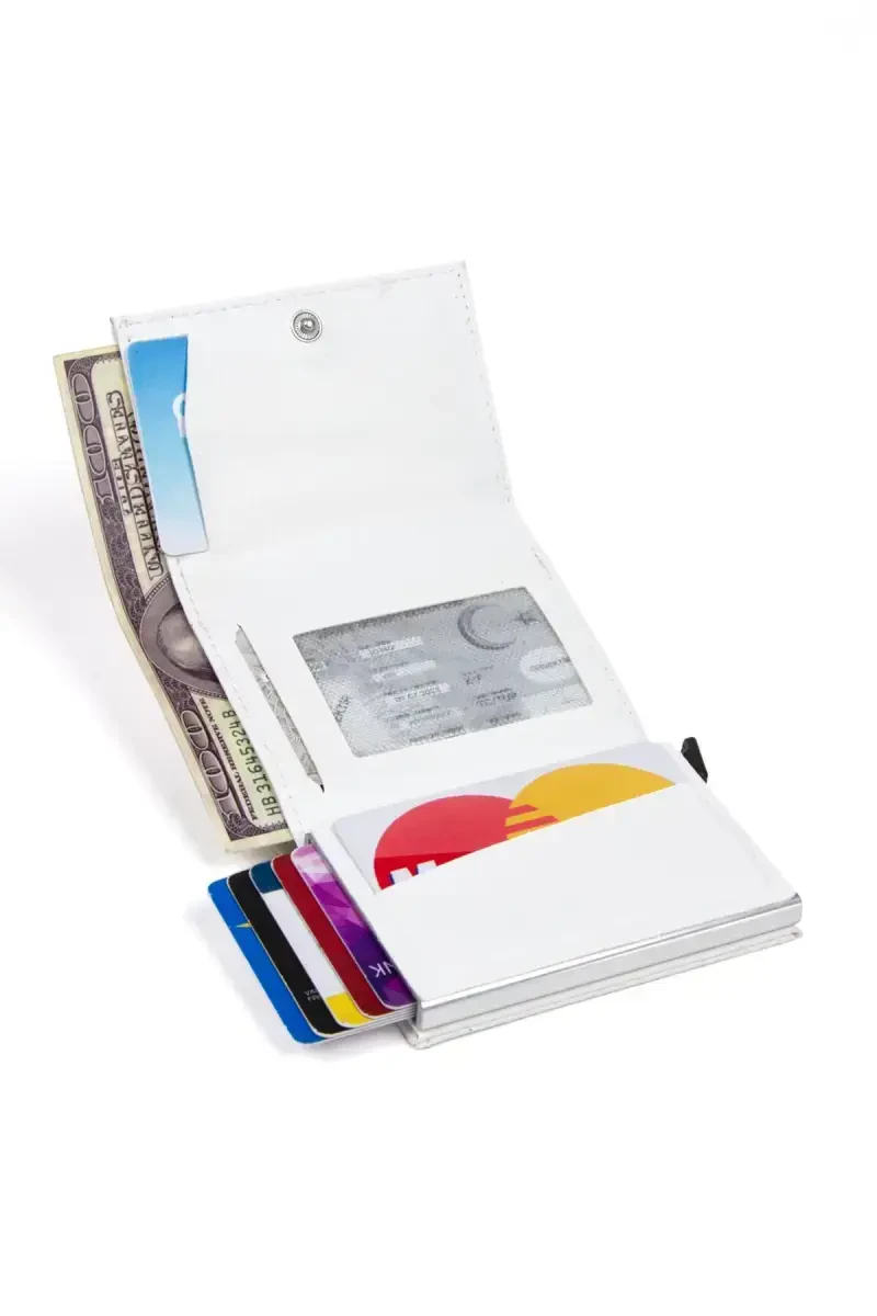 Женский кожаный картхолдер-кошелек | Алюминиевый механизм, выдвижной, с RFID-защитой | Белая элегантность + брелок в подарок