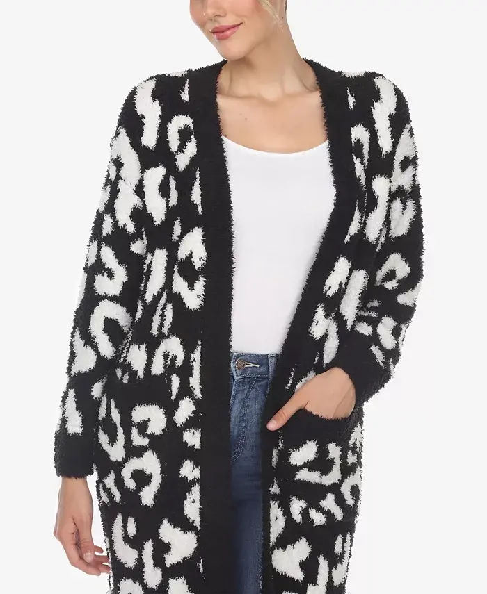 This cardigan features a leopard print pattern, open front, long sleeves, and a sherpa fabric. It is made of 100% polyester and is machine washable. The cardigan is perfect for layering and can be dressed up or down.