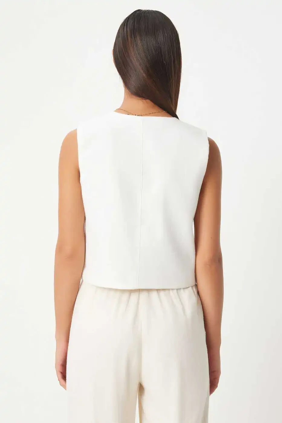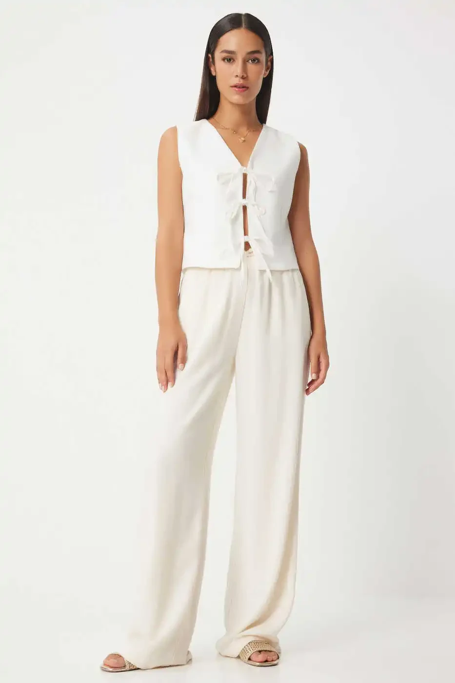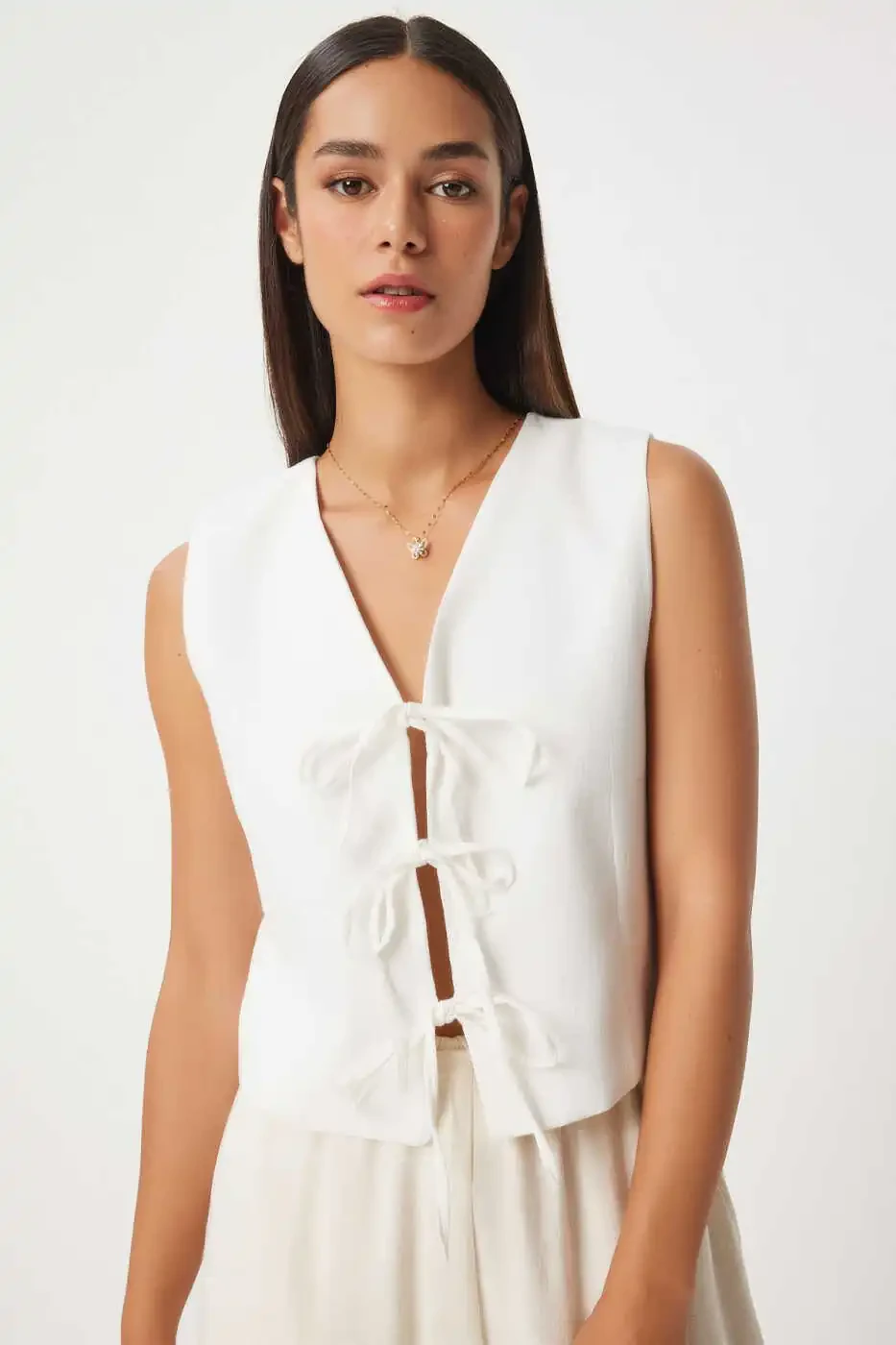 Льняная жилетка, белый бант, женская жилетка, летняя жилетка, жилетка с V-образным вырезом, обычная жилетка, элегантная жилетка, льняная одежда, жилетка Trendyol, GP00010