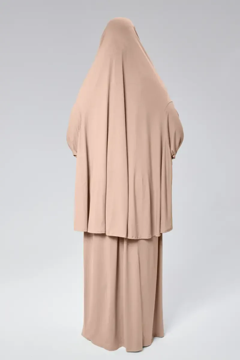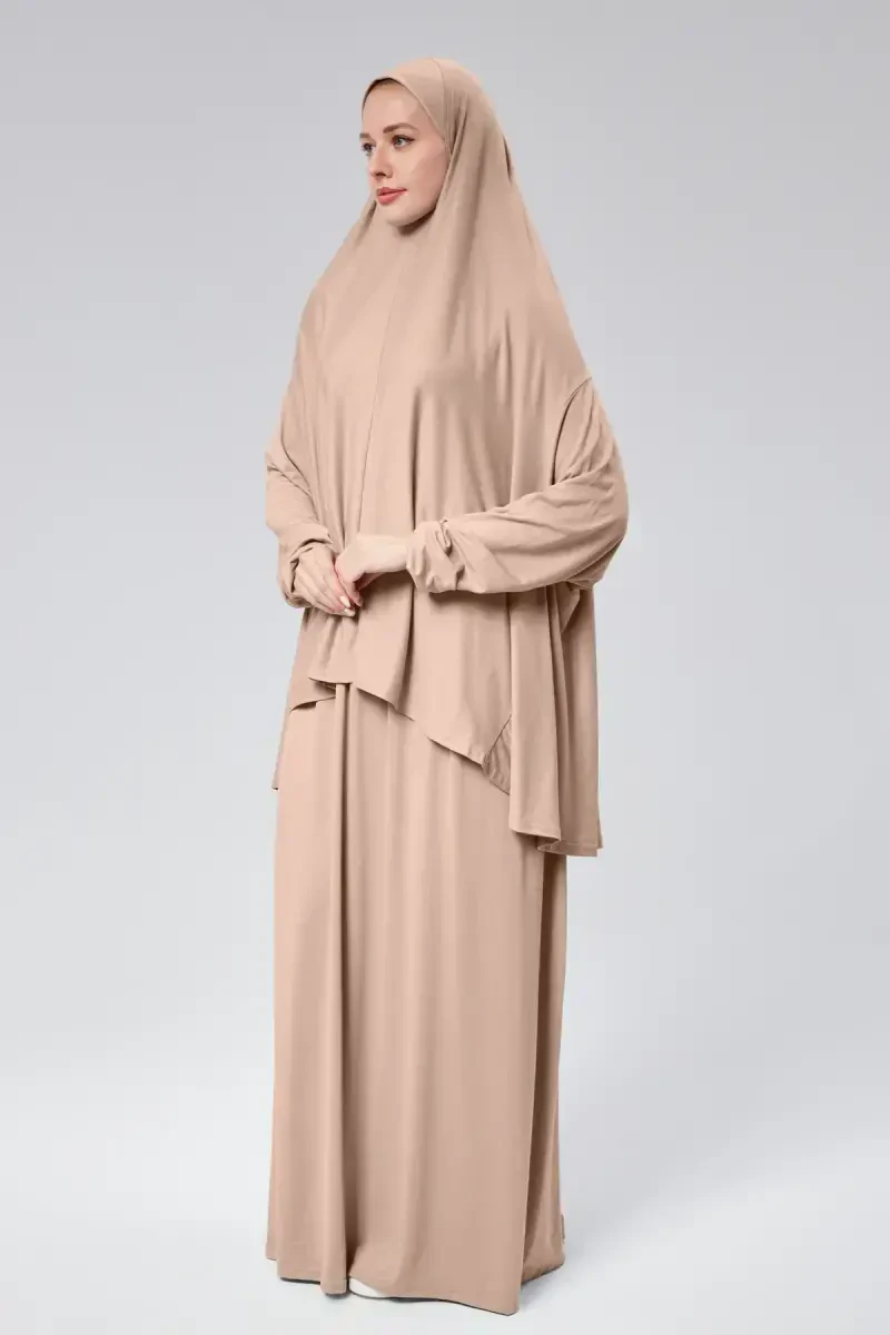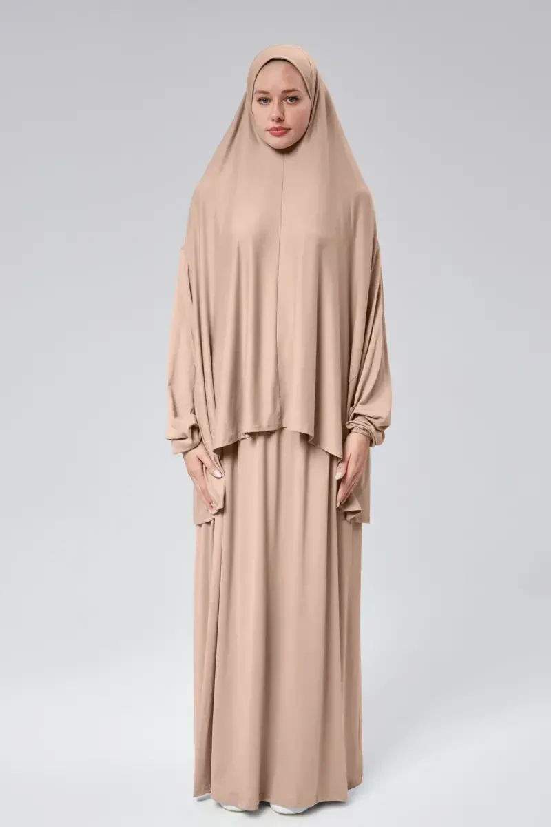 Женское платье для намаза из двух частей от SonBaharModa, поставляемое в комплекте с платком, подарит вам полноценный опыт ношения хиджаба. Органический хлопковый материал, резинка на рукавах и нескользящие свойства делают его удобным и практичным вариантом. Это элегантное и функциональное платье, которое будет сопровождать вас, особенно во время намаза, также идеально подходит для повседневного использования. Благодаря прямому крою и удобной ткани оно не ограничивает вашу свободу движений, а платок, закрывающий шею, обеспечивает полный хиджаб без необходимости надевать шапочку. Платок выглядит как полупелерина спереди и сзади, его можно легко снимать и надевать. Таким образом, вы можете создавать разные стили хиджаба в разных средах. Благодаря высококачественной ткани из вискозы и лайкры, он не просвечивает, не скользит и обеспечивает комфортное ношение в течение всего дня. Облегчает вашу жизнь благодаря своей нежной структуре и не требует глажки. Это платье для намаза, сочетающее в себе элегантность и комфорт, занимает особое место в женской моде. Эластичная структура адаптируется к телу, а тот факт, что оно изготовлено из полностью органических тканей, защищает ваше здоровье. Не содержащая полиэстера структура и эластичная текстура делают его устойчивым к морщинам и обеспечивают воздухопроницаемость. Благодаря легкой ткани подходит для длительного и частого использования. Это платье, которое вы можете с комфортом использовать во время посещения хаджа и умры, будет сопровождать вас в течение четырех сезонов. Благодаря конструкции без молнии его можно легко и удобно надевать. Высокая влагоудерживающая способность устраняет проблему потоотделения. Бежевый цвет, который легко комбинируется, подходит к любому стилю. Этот спасительный предмет станет незаменимым в вашем гардеробе.