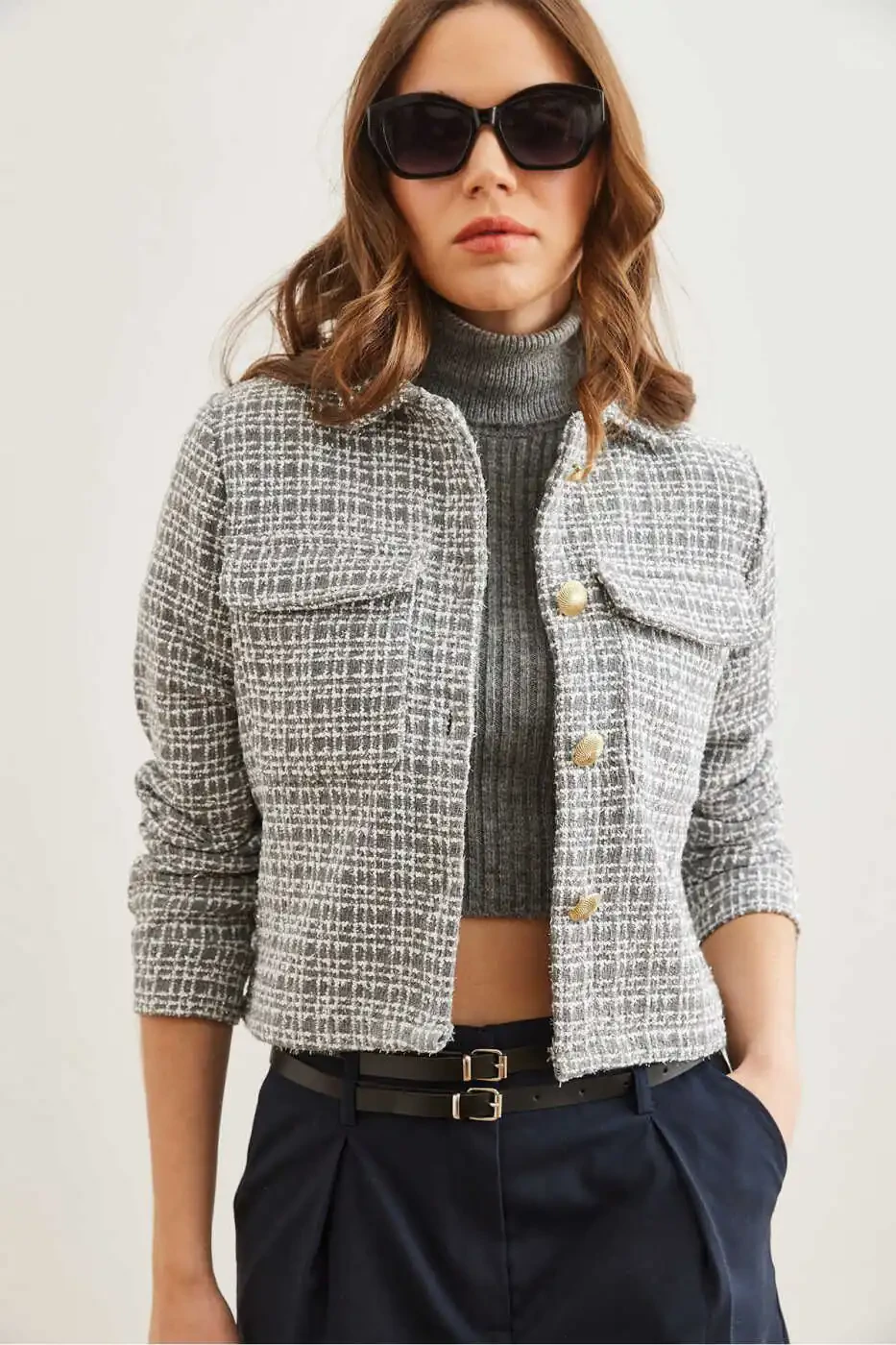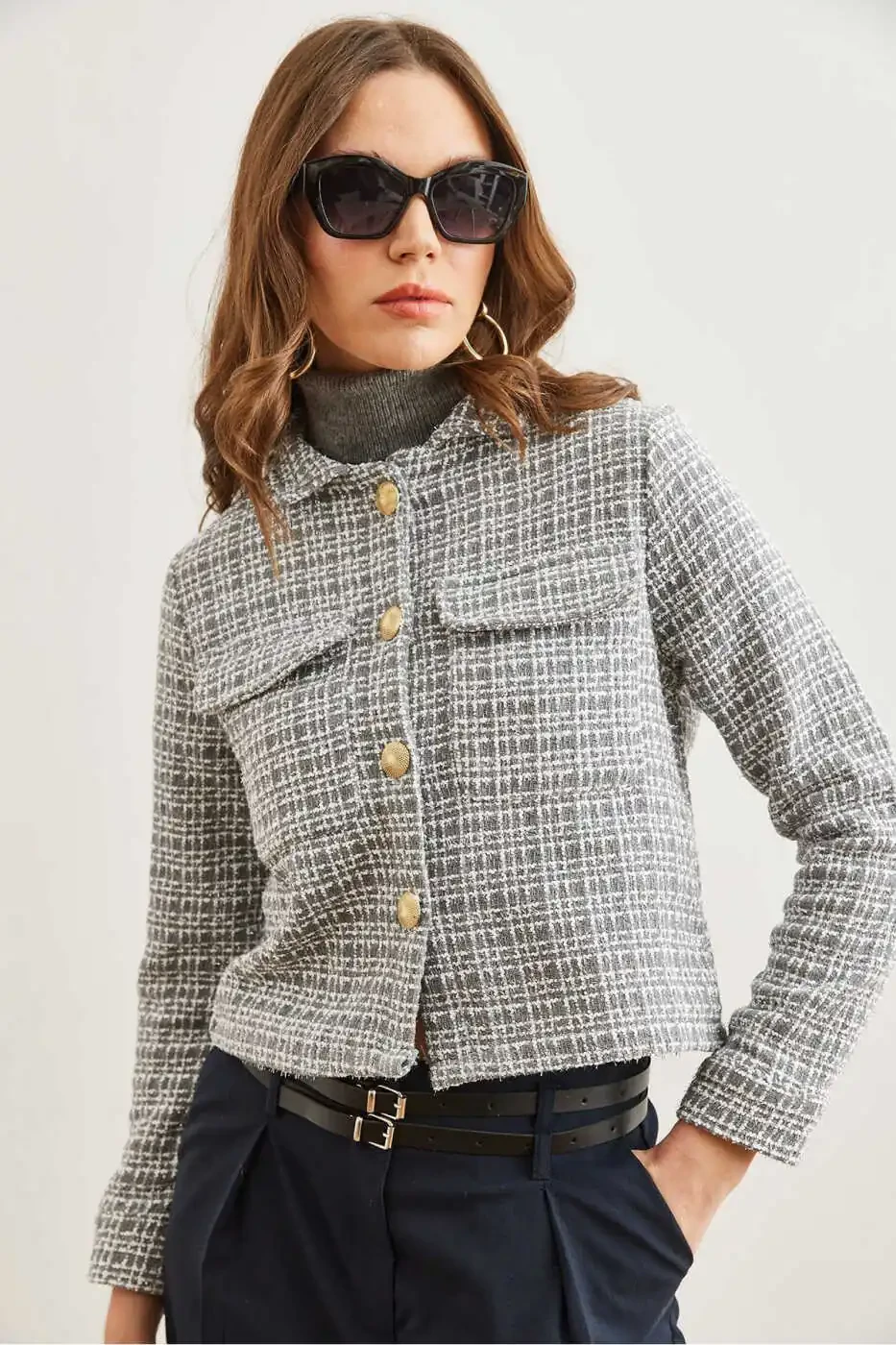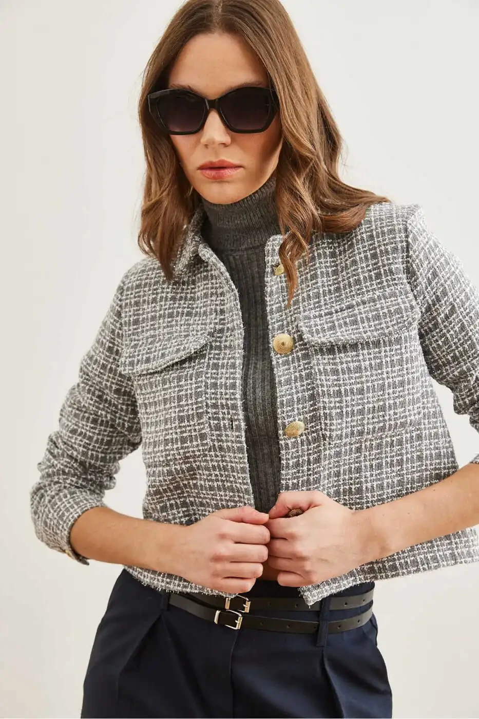 Женский жакет, Дымчатый жакет, Жакет на пуговицах, Твидовый жакет, Жакет со стразами, CKT-19000411
