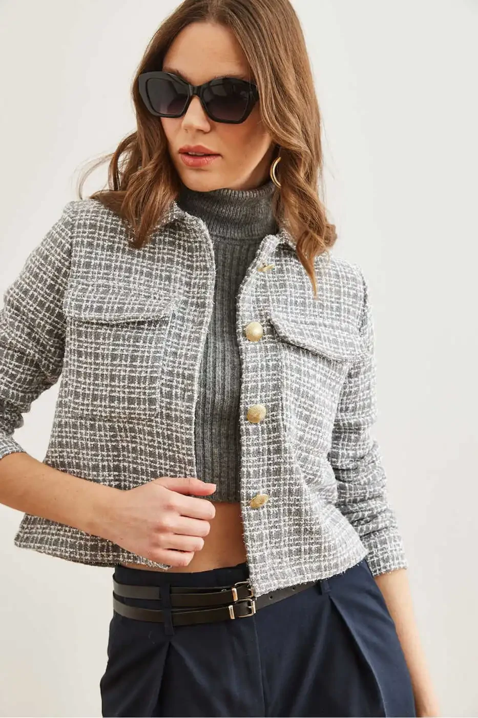 **Женский твидовый жакет дымчатого цвета с карманами и пуговицами, украшенный стразами CKT-19000411****Код продукта:** CKT-19000411Этот шикарный и изысканный твидовый жакет станет вневременным дополнением к вашему гардеробу.**Особенности:*** **Материал:** 50% хлопок, 50% полиэстер* **Цвет:** Дымчатый* **Размеры:** Длина/обхват груди: 49/36 см* **Карманы:** Дымчатые карманы* **Пуговицы:** Застежка на пуговицы* **Стразы:** Привлекательные детали со стразами**Параметры модели:*** Рост: 1,74* Обхват груди: 80* Обхват талии: 60* Обхват бедер: 90* Размер на модели: S/36/1**Примечания:*** Цвета могут отличаться из-за разницы в освещении в студии.* На изделие предоставляется возможность бесплатного возврата в течение 15 дней.