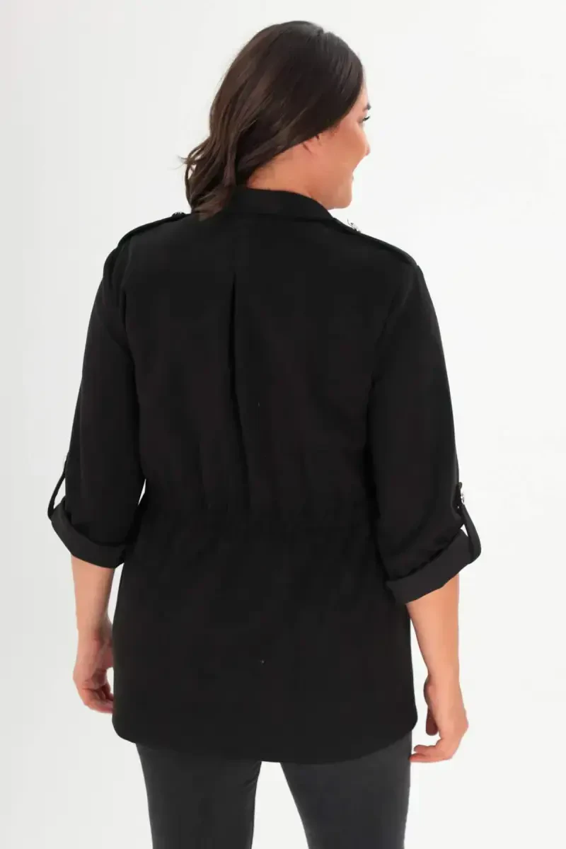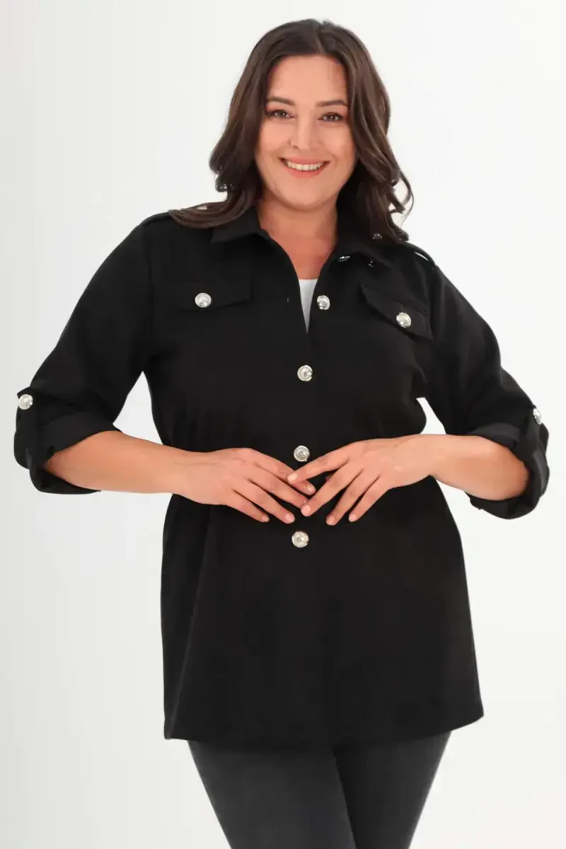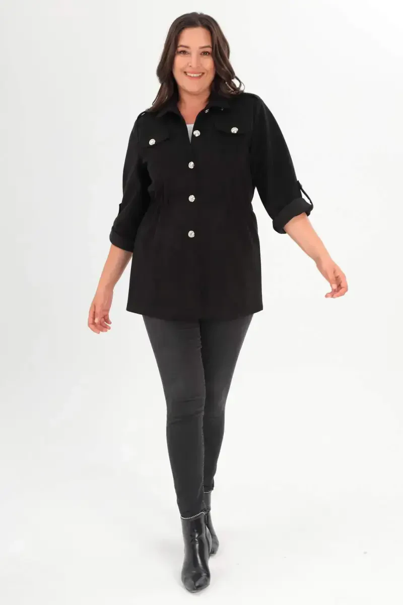Представляем женский плащ большого размера черного цвета с поясом на талии и карманами – эталон сочетания комфорта и элегантности! Этот стильный плащ длиной 75 см тщательно изготовлен с классическим кроем и текстурированной тканью, которая подчеркнет ваш мужественный стиль.