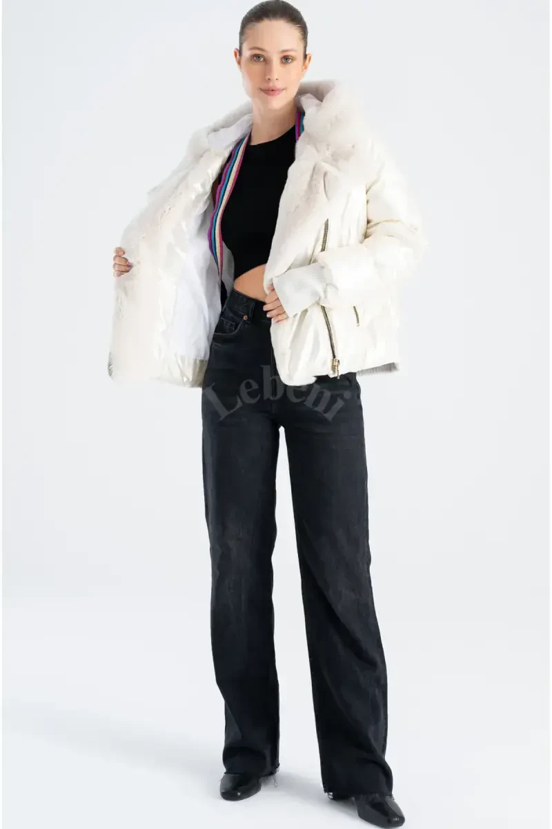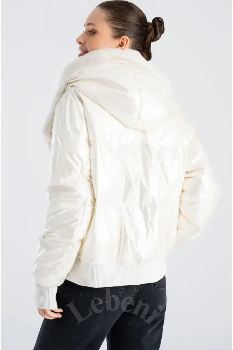 Кремовый Белый Пуховик с Капюшоном и Меховой Отделкой | Женский Зимний Пуховик