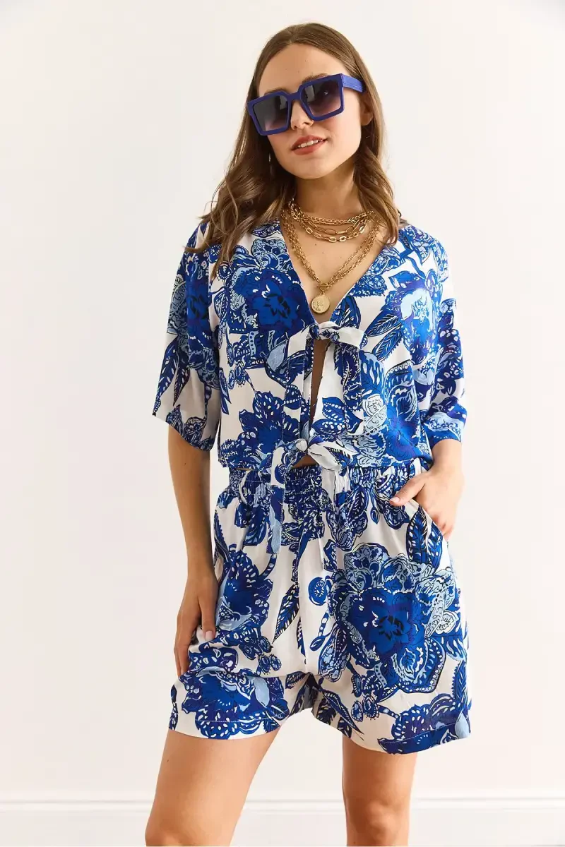 Женский платок, темно-синяя блузка, шорты с карманами, тканые. 100% хлопок. Рисунок платка использован на блузке и шортах. На блузке спереди есть пуговицы. У шорт есть удобные карманы по бокам.**Описание товара**Познакомьтесь с нашим тканым комплектом, состоящим из женского платка, темно-синей блузки и шорт с карманами, который станет незаменимой вещью в вашем гардеробе, сочетая в себе элегантность и комфорт! Этот уникальный дизайн, который позволит вам выделиться не только в повседневной жизни, но и на особых мероприятиях, позволяет вашей коже дышать благодаря 100% хлопковой ткани, а рисунок платка придает ей динамичный и современный вид. Изящные пуговицы спереди блузки добавляют ей элегантности, а удобные карманы по бокам шорт обеспечивают практичное использование. Этот комплект поможет вам создать неповторимый стиль, сочетая в себе благородство темно-синего цвета и энергию рисунка платка. Будь то расслабленный день дома, приятный перерыв на кофе с друзьями или элегантный ужин, этот комплект подойдет для любого случая и всегда заставит вас чувствовать себя хорошо. Благодаря хлопковой ткани он сохраняет прохладу и свежесть в летние месяцы и может быть удобно использован весной. Рисунок платка искусно использован на блузке и шортах для обеспечения целостности. Блузка имеет облегающий крой, но не ограничивает свободу движений. Шорты имеют эластичную талию, что обеспечивает комфортное ношение в течение всего дня. Карманы позволяют безопасно носить телефон, ключи и другие мелкие предметы. Этот комплект не только стильный, но и универсальный. Вы можете комбинировать блузку с разными юбками или брюками, а шорты - с футболками или рубашками, создавая разные стили. Вы также можете персонализировать свой стиль с помощью выбора аксессуаров, чтобы всегда выглядеть оригинально и привлекательно. Наш тканый комплект, состоящий из женского платка, темно-синей блузки и шорт с карманами, сочетает в себе качественные материалы, стильный дизайн и удобство ношения, оправдает ваши ожидания и станет одной из самых любимых вещей в вашем гардеробе. Закажите сейчас и наслаждайтесь элегантностью и комфортом!**Характеристики продукта*** 100% хлопок* Блузка и шорты с рисунком платка* Пуговицы спереди блузки* Удобные карманы по бокам шорт* Удобный и стильный дизайн* Подходит для повседневной носки и особых случаев* Высококачественная ткань* Дышащая ткань* Эластичная талия шорт* Облегающий крой блузки* Универсальный комплект* Благородство темно-синего цвета* Обеспечивает свободу движений* Современный и привлекательный вид* Длительный срок службы**Дополнительная информация**На модели размер S/36. Чтобы изделие прослужило долго, соблюдайте инструкции по стирке на этикетке. Цветовые тона могут отличаться в зависимости от характеристик экрана. Наша продукция доставляется вам в тщательно подготовленной упаковке.