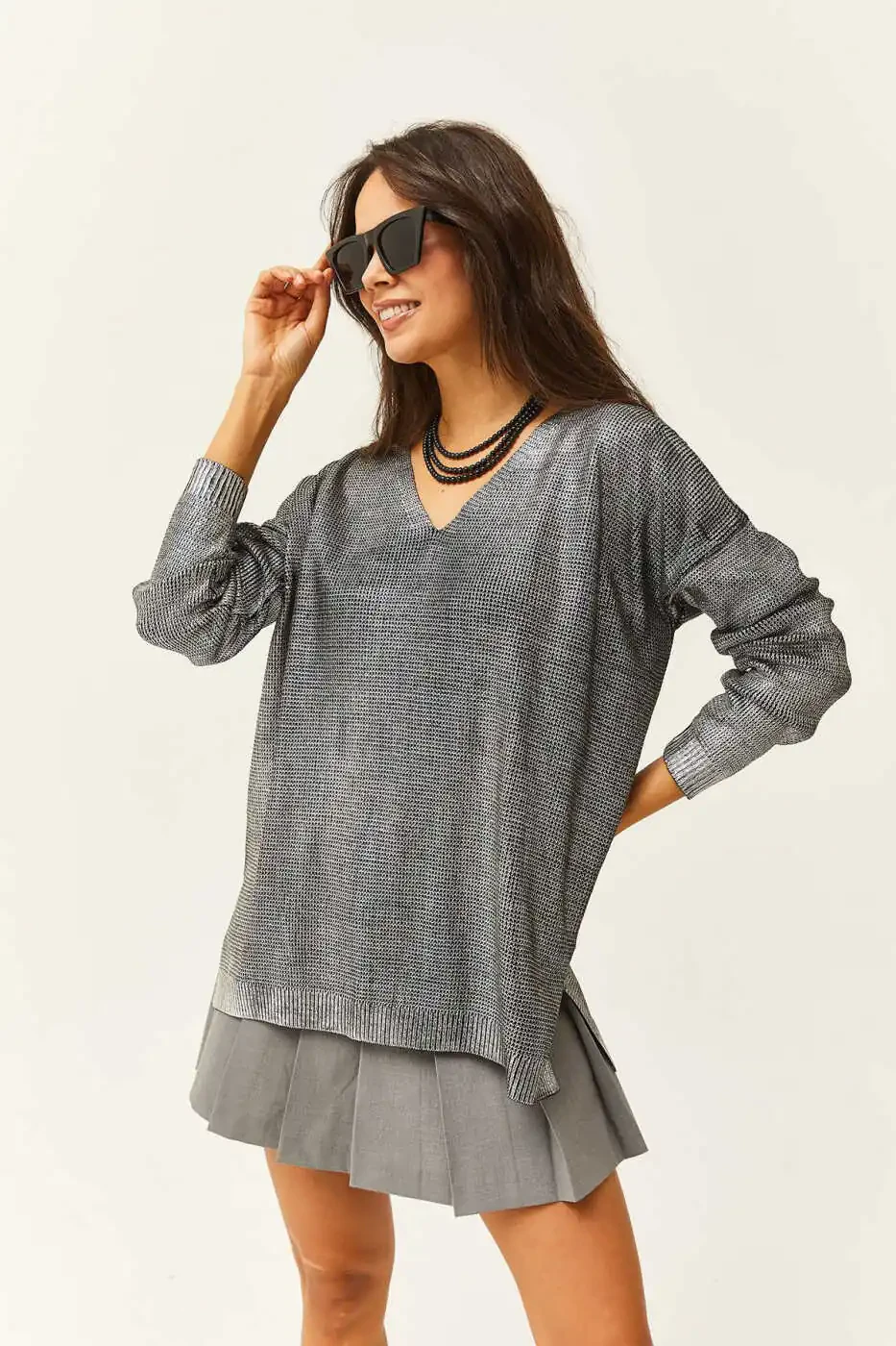 Женский вязаный свитер, серебряный V-образный вырез, свободный металлический трикотаж, трикотаж с длинным рукавом, удобный трикотаж, трикотаж с V-образным вырезом
