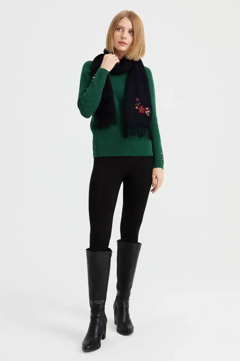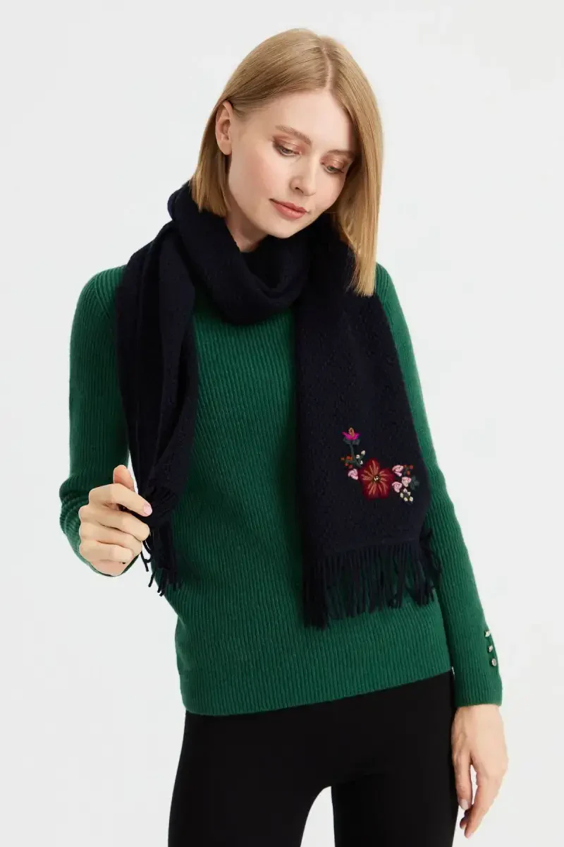 Женский вязаный шерстяной шарф с вышивкой - Т.Синий | Элегантность и тепло
