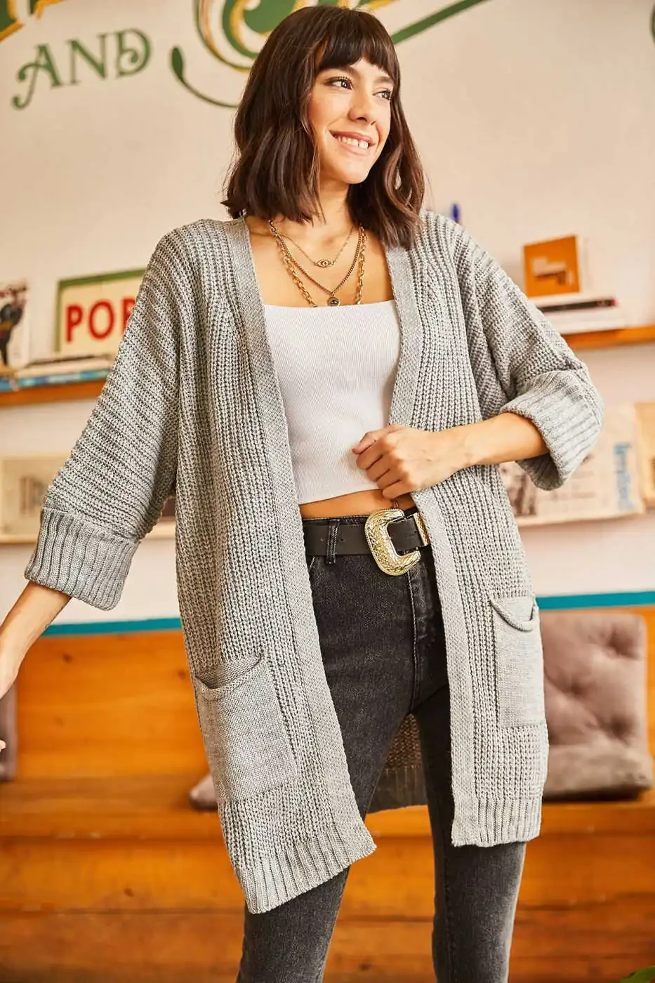 Наш серый кардиган, незаменимый для женщин, станет незаменимым для ваших повседневных комбинаций. Этот кардиган с его свободным кроем и удобной тканью можно легко носить весь день. Этот кардиган, который является как стильным, так и функциональным благодаря накладным карманам на рукавах, можно сочетать как с джинсами, так и с юбками.