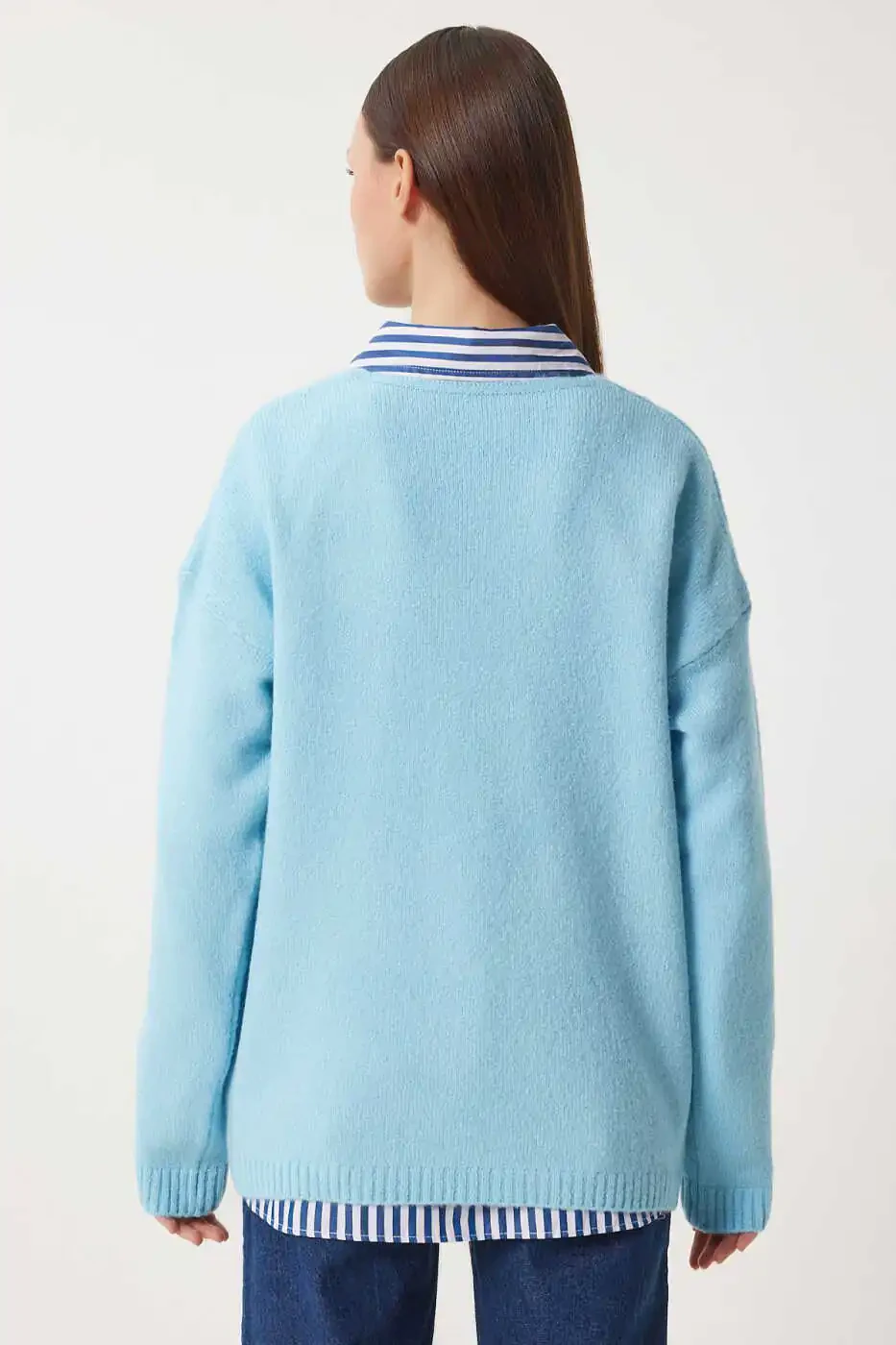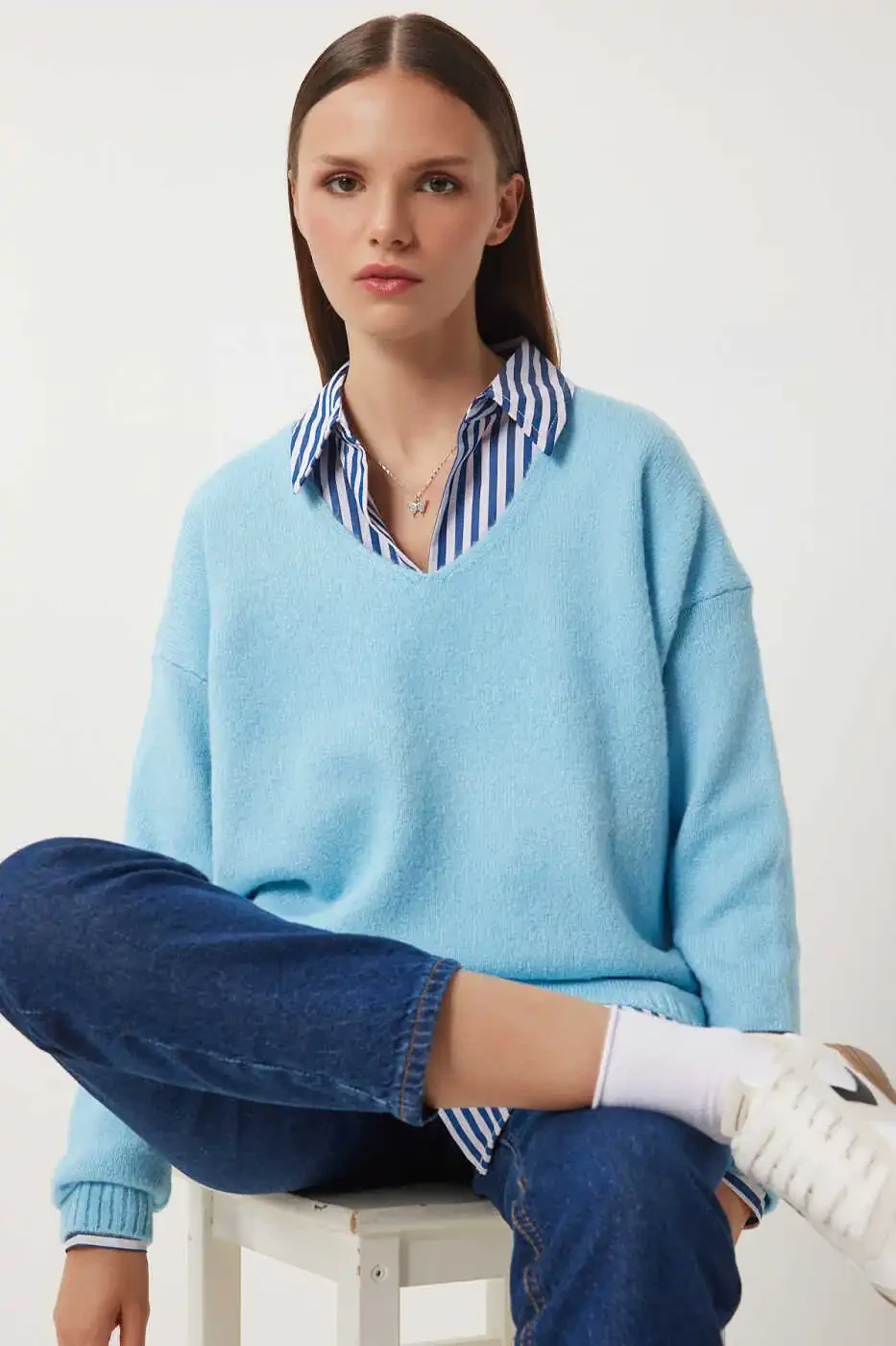 Женский Светло-Голубой Трикотажный Джемпер с V-образным вырезом ZA00063-Светло Ma