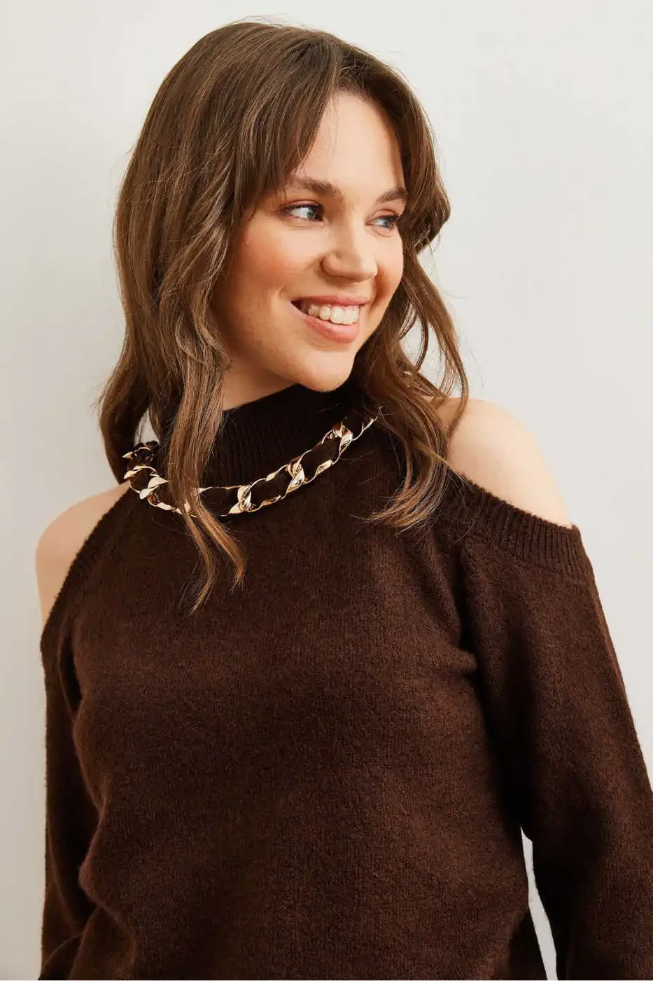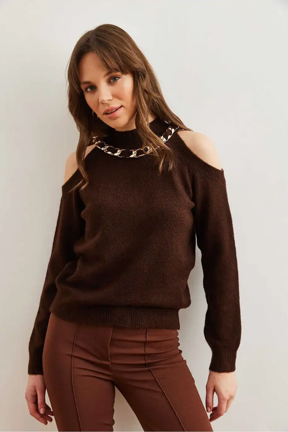 Вязаный свитер цвета горького кофе, свитер с мягкой текстурой, свитер с деталями из толстых цепей, женский свитер, свитер Olalook