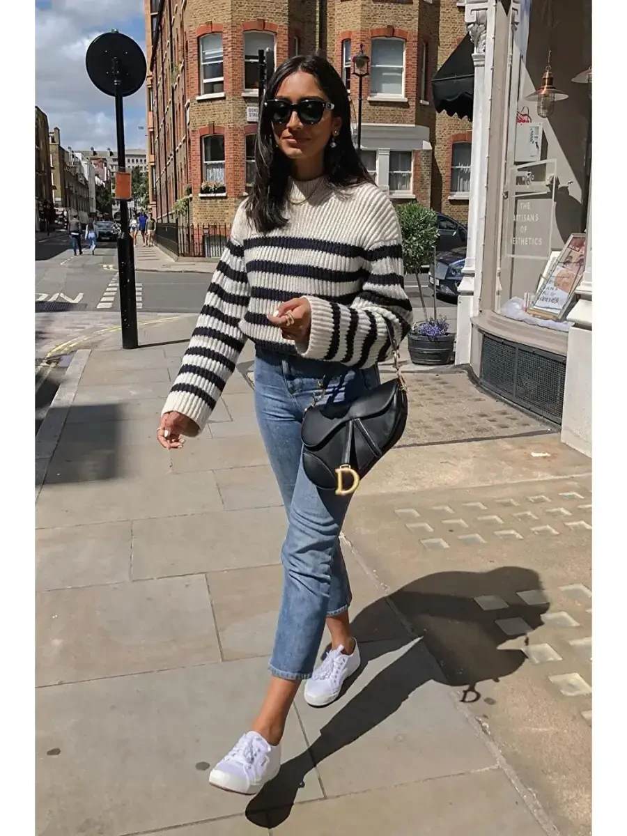 Вневременная элегантность черного цвета и современный штрих тонких полосок сделают его подходящим для любого стиля. Свитер разработан с свободным кроем, обеспечивая стильный внешний вид без ограничения свободы движений. Вы можете легко выбрать его для повседневной жизни, для встреч с друзьями или для особых случаев.