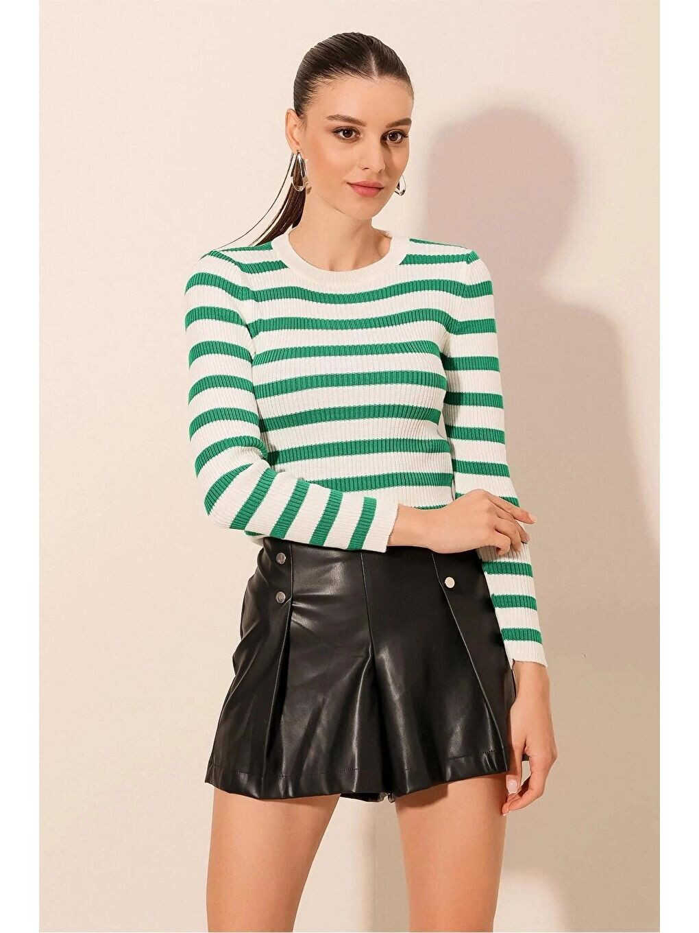 Сочетая стиль и комфорт, этот женский зеленый полосатый трикотажный свитер с круглым вырезом станет незаменимым элементом вашего гардероба. Свитер, изготовленный из мягкой и высококачественной трикотажной ткани, обеспечивает комфортную носку в течение всего дня. Элегантные зеленые полосы добавляют динамизма простому дизайну и подходят к любому стилю. Деталь круглой горловины добавляет стильный штрих вашей шее. Вы можете легко носить этот свитер как в повседневной жизни, так и по особым случаям, он прекрасно сочетается с джинсами, юбками и леггинсами.