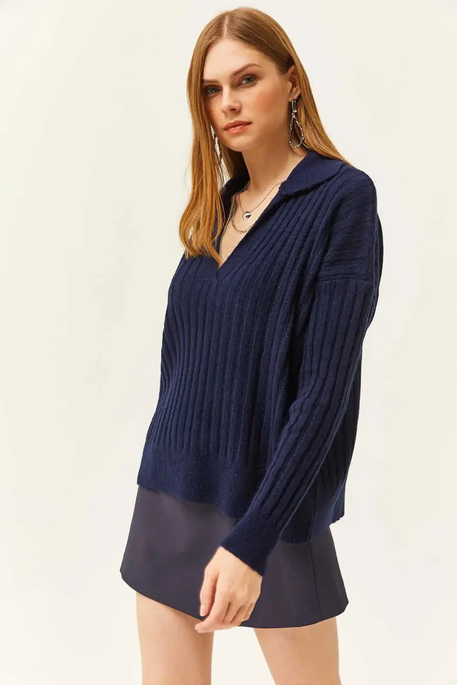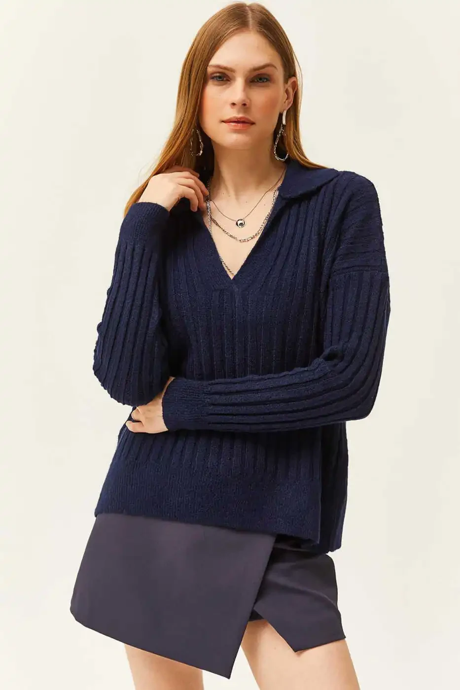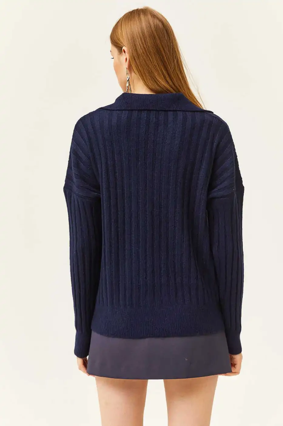 Женский свитер синего цвета с воротником-поло, мягкой текстурой и толстой пряжей | Trendyol