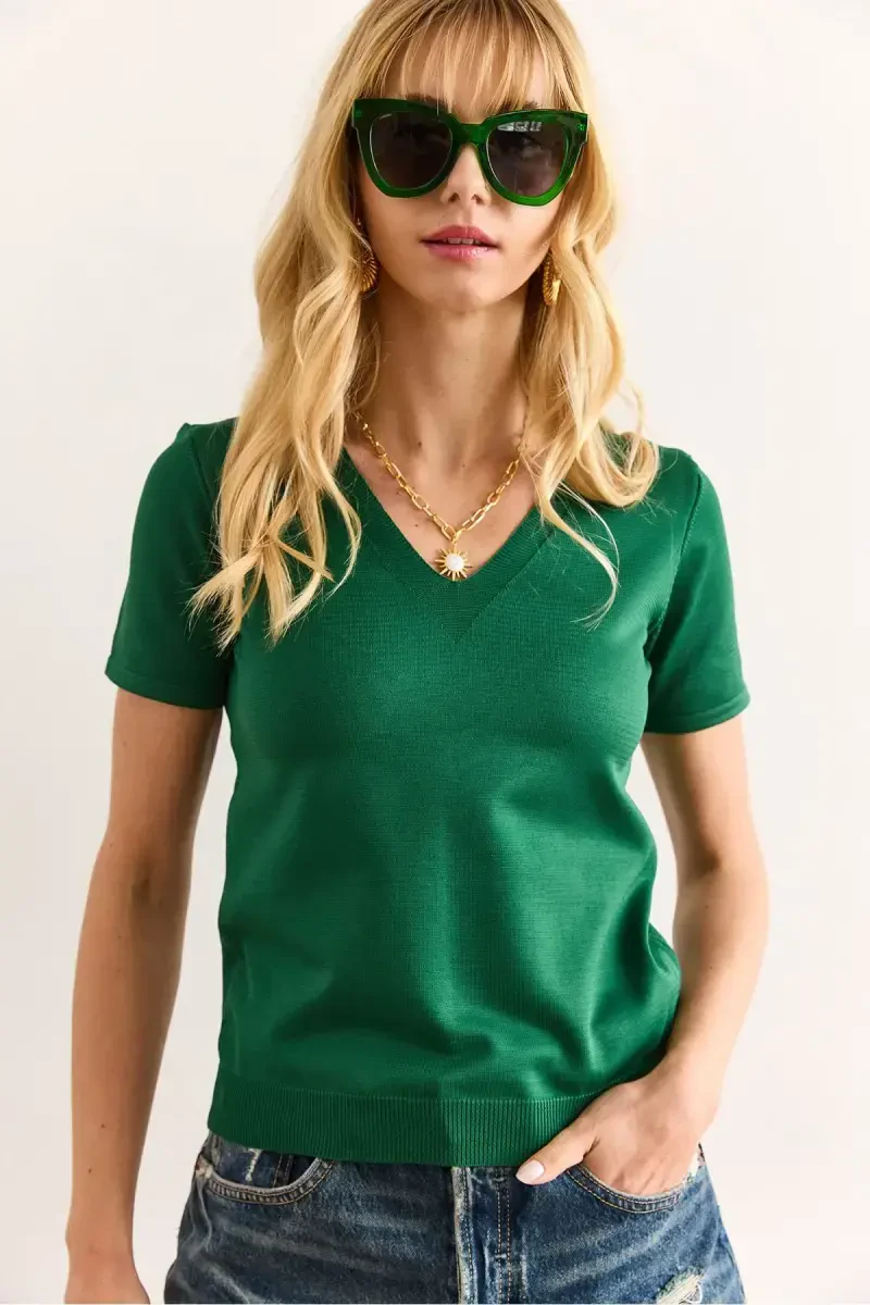 Женский трикотаж, травянисто-зеленый, V-образный вырез, короткий рукав, базовый трикотаж, трикотажная блузка, летний трикотаж, удобный трикотаж, стильный трикотаж, повседневный трикотаж
