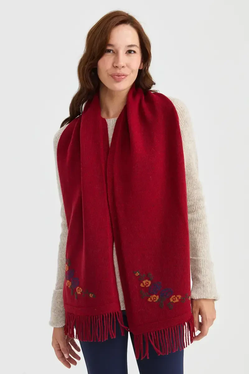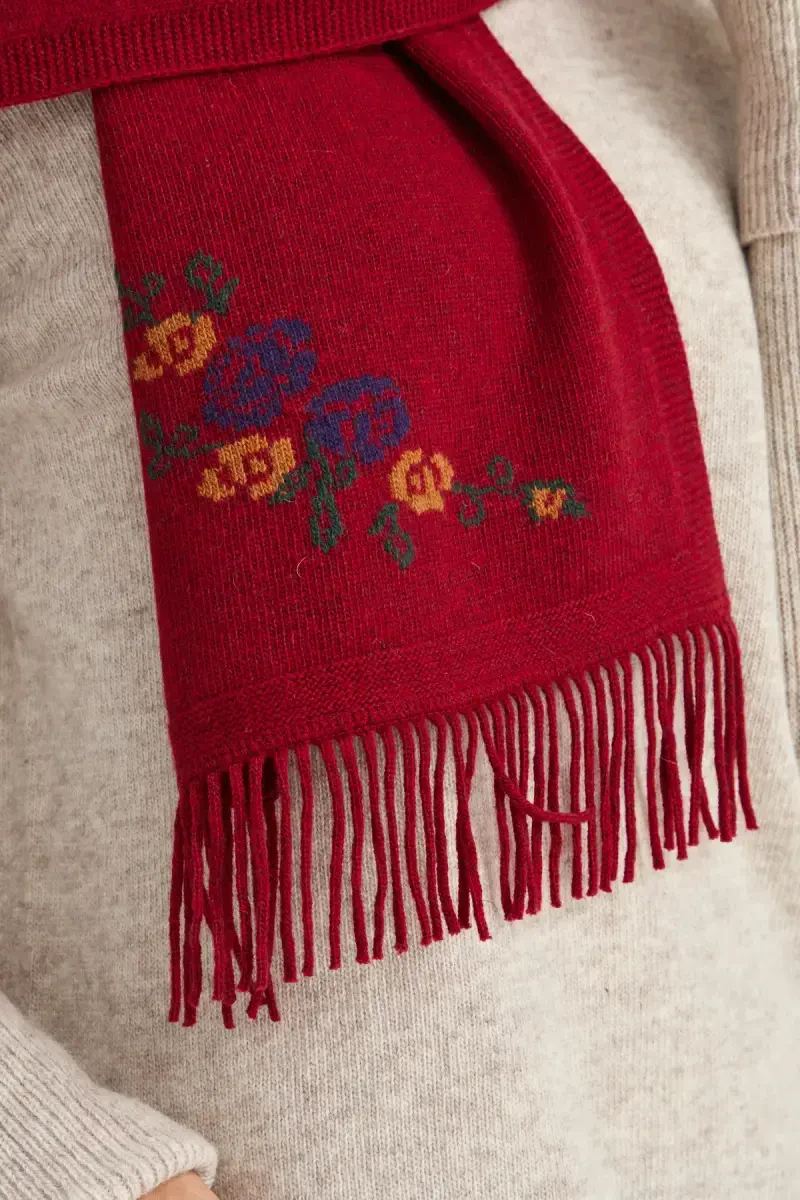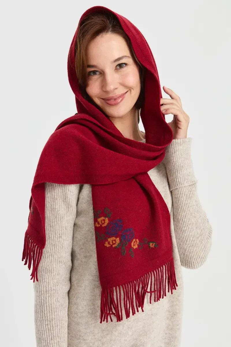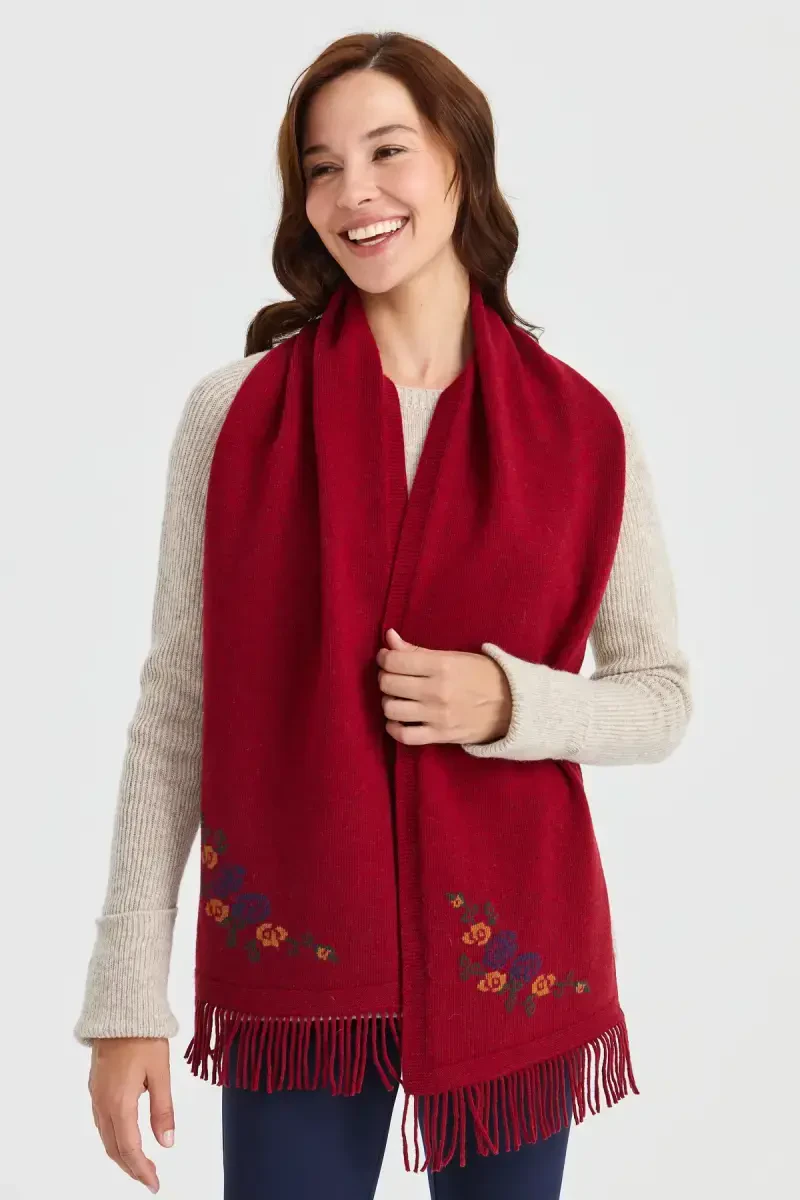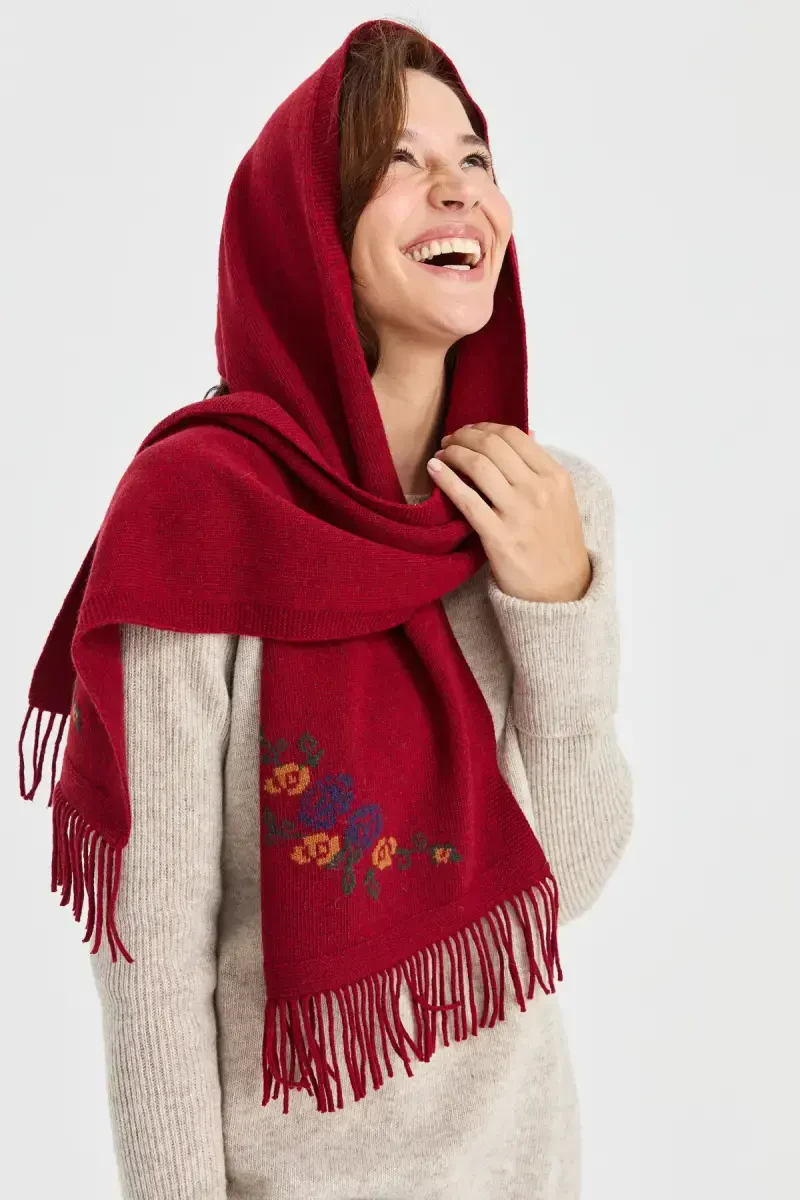 Цветочный трикотажный шарф | Шерстяной красный шарф | Женский стильный шарф