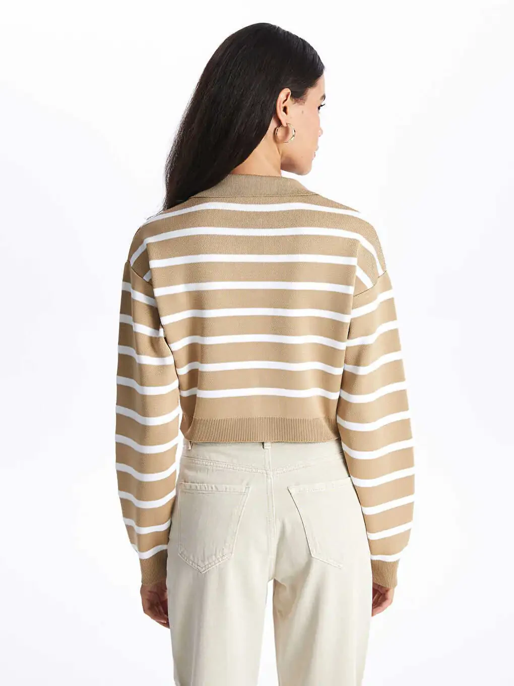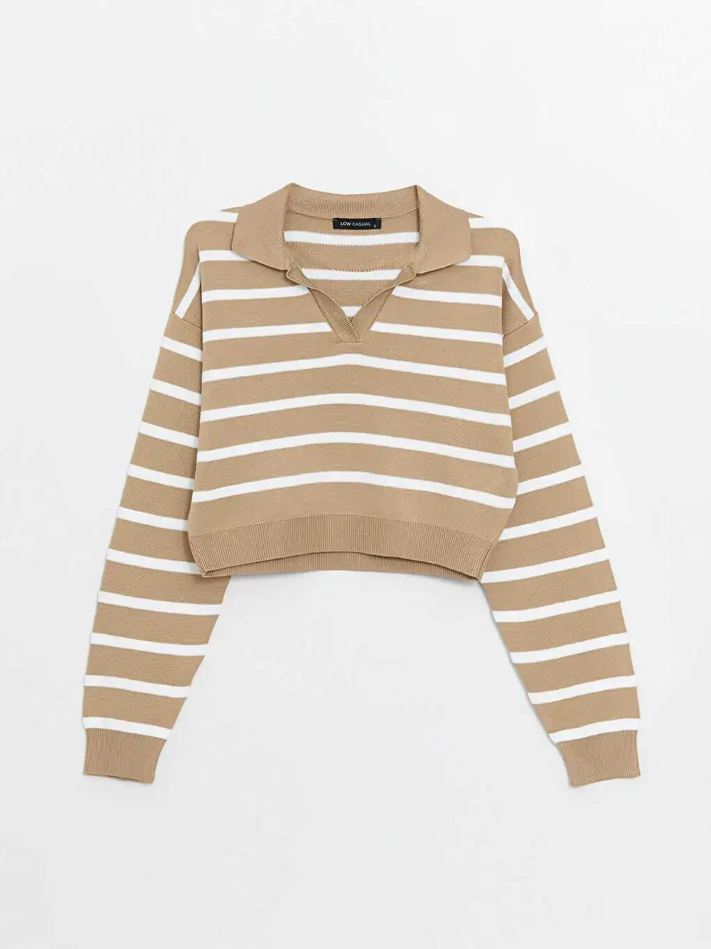 Приобретите женский трикотажный свитер с полосатым кропом с воротником-поло и создайте стильный и комфортный образ! Закажите прямо сейчас!