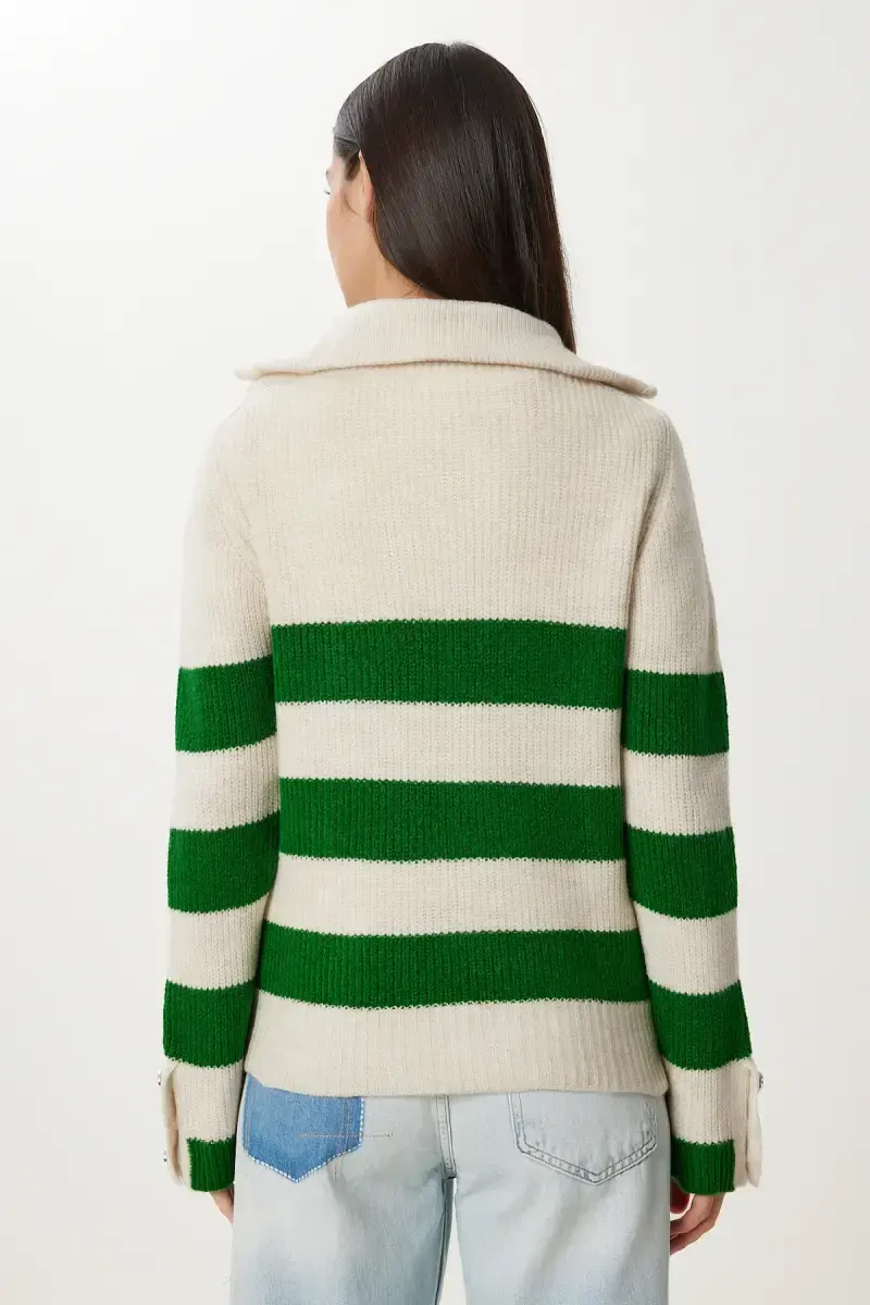 Оставайтесь стильной и теплой в женском трикотажном свитере в полоску с воротником-стойкой на молнии костяного и зеленого цвета. Этот свитер особого дизайна отличается современными деталями и удобной структурой. Воротник-стойка защищает шею в холодную погоду, а молния позволяет создавать разные стили. Изящное сочетание костяного и зеленого цветов придаст изысканность любому вашему образу. Независимо от того, носите ли вы его в повседневной жизни или на особом мероприятии, этот свитер всегда подчеркнет вашу элегантность. Полосатый узор добавляет вашему свитеру динамичности, а высококачественная трикотажная ткань обеспечивает комфорт в течение всего дня. Этот свитер - идеальный выбор для женщин, которые хотят быть стильными, не жертвуя при этом комфортом. Вы можете легко сочетать его с различными аксессуарами и брюками, чтобы отразить свой собственный стиль. Этот трикотажный свитер, который станет одним из самых любимых предметов вашего гардероба, согреет вас и дополнит ваш образ.