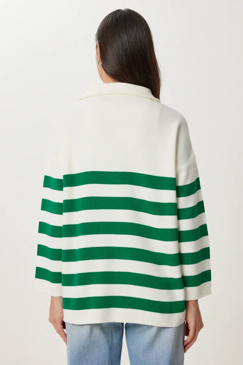 Трикотажный свитер: Зеленый Белый в полоску, на молнии, оверсайз. Стильный и удобный!